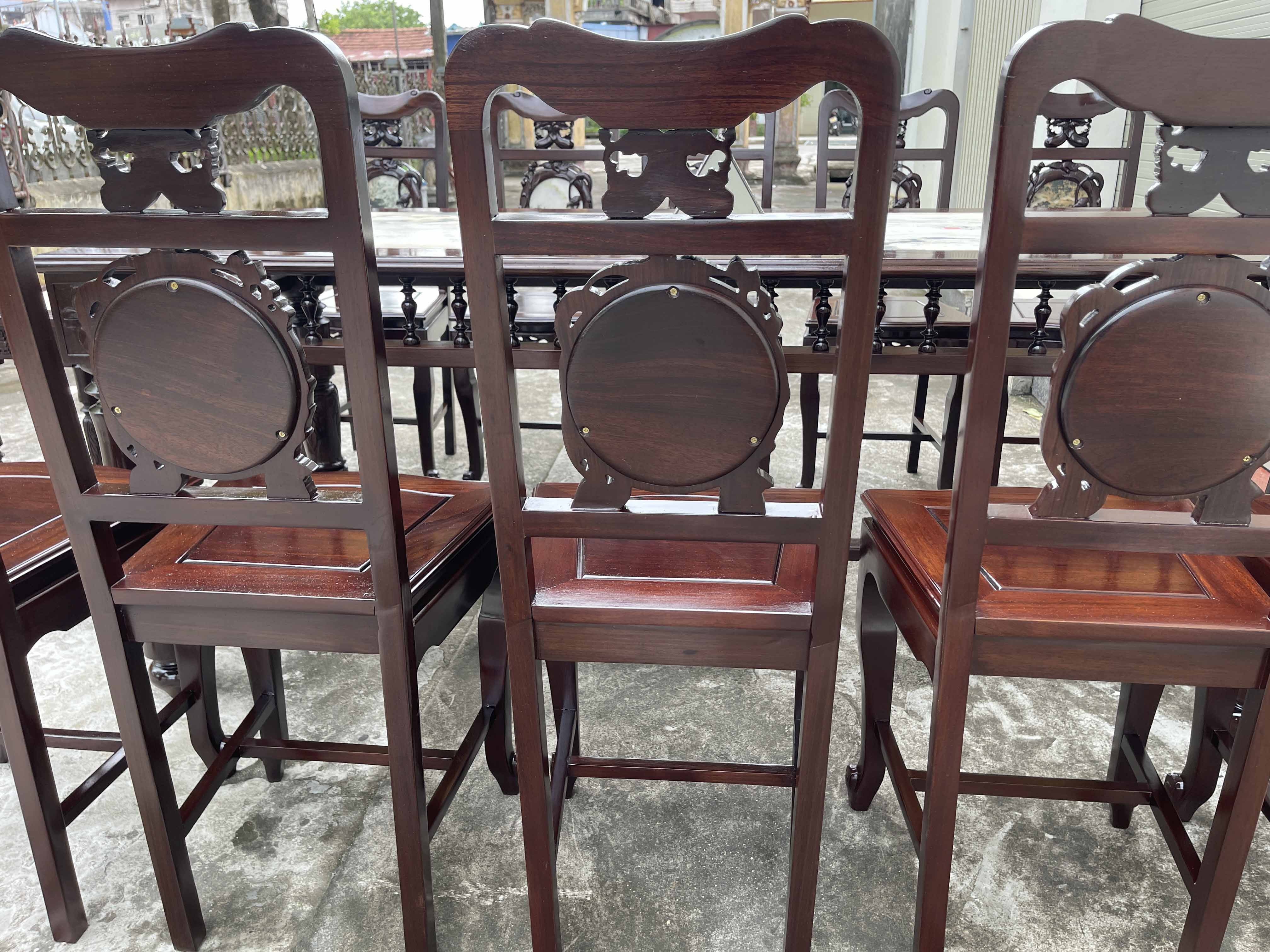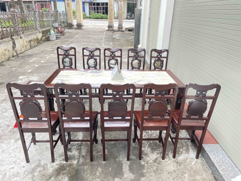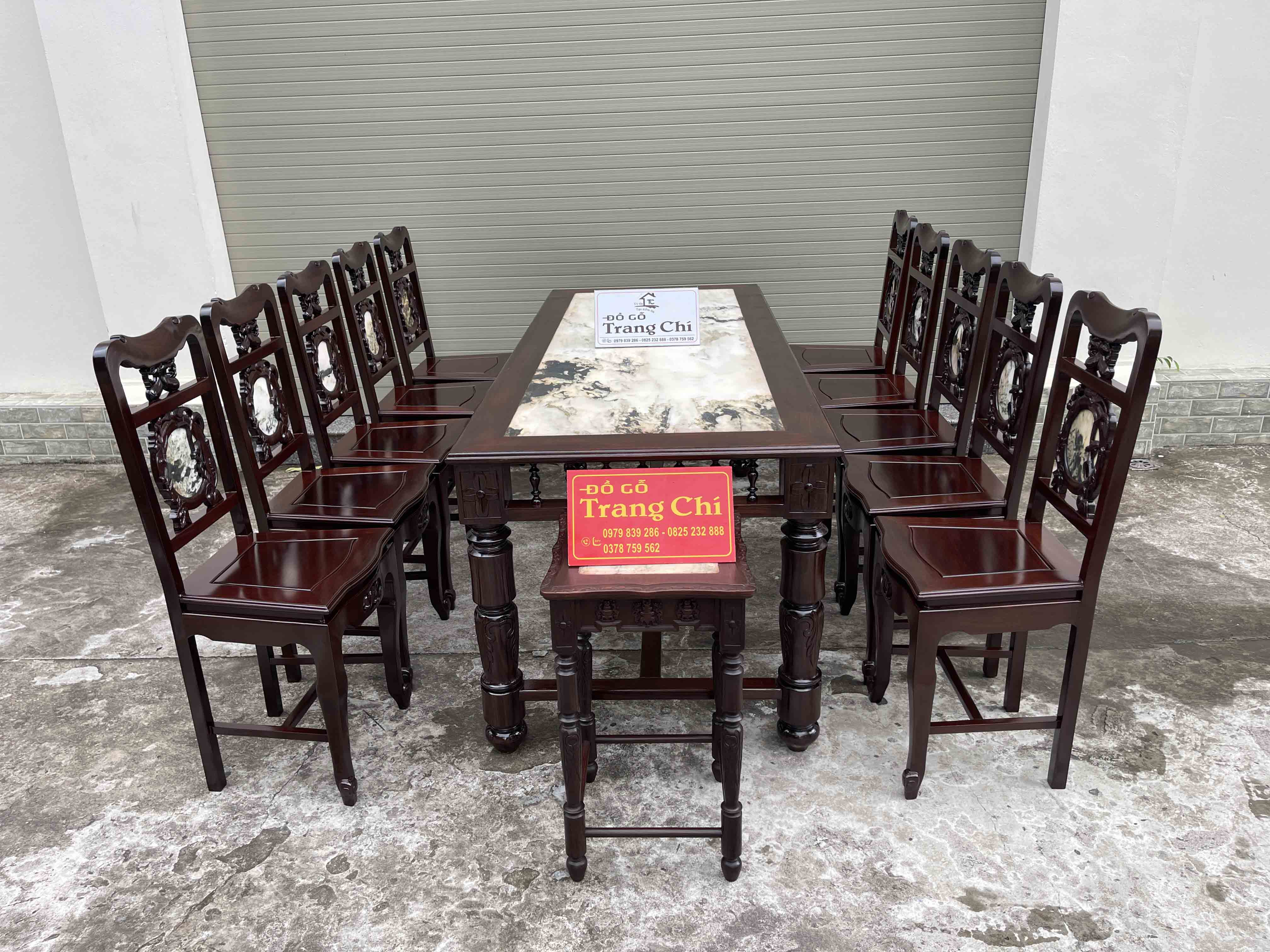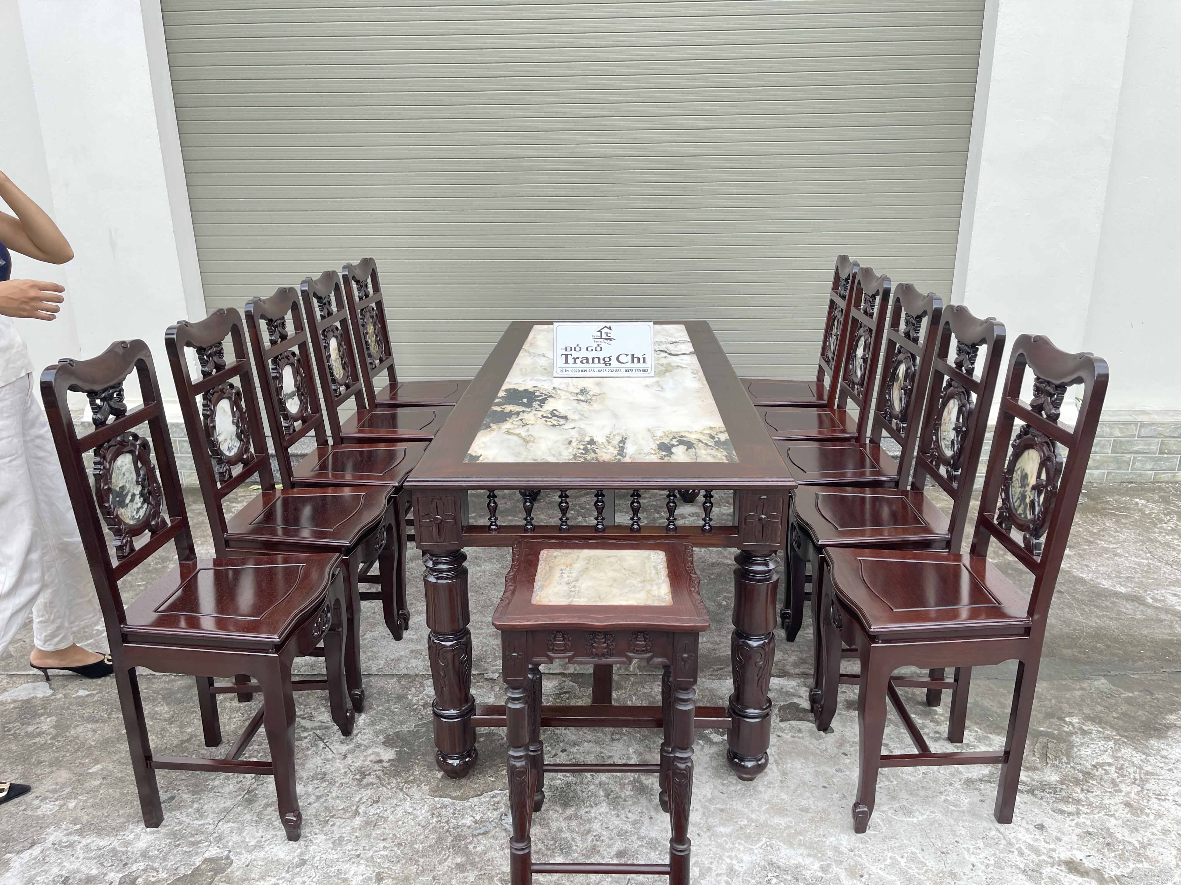 xin giới thiệu tới quý khách hàng mẫu bàn ăn rất tiện và sang sản phẩm Bộ Bàn Ghế Ăn 12 Món Bàn Chữ Nhật sau đây cơ sở chúng em giới thiệu mang kiểu dáng nổi bật mặt bàn chữ nhật mặt đá rộng làm bàn ăn để đồ cực thoải mái. DánG ghế có tựa ngồi thoải mái hoa văn được cơ sở chúng em đục chạm nổi bật và bắt mặt. Bộ bàn ăn nên tới 10 ghế 1 đôn có thể tiếp được nhiều vị khách nơi quây quần, thảo luận dùng tiệc. Bộ bàn ăn gỗ gụ bền không chỉ thể hiện được nét tịnh tế, độ bền cao còn là một món quà cao cấp dành tặng cho quý gia chủ rất đặc biệt và sang trọng