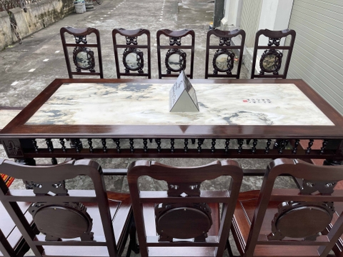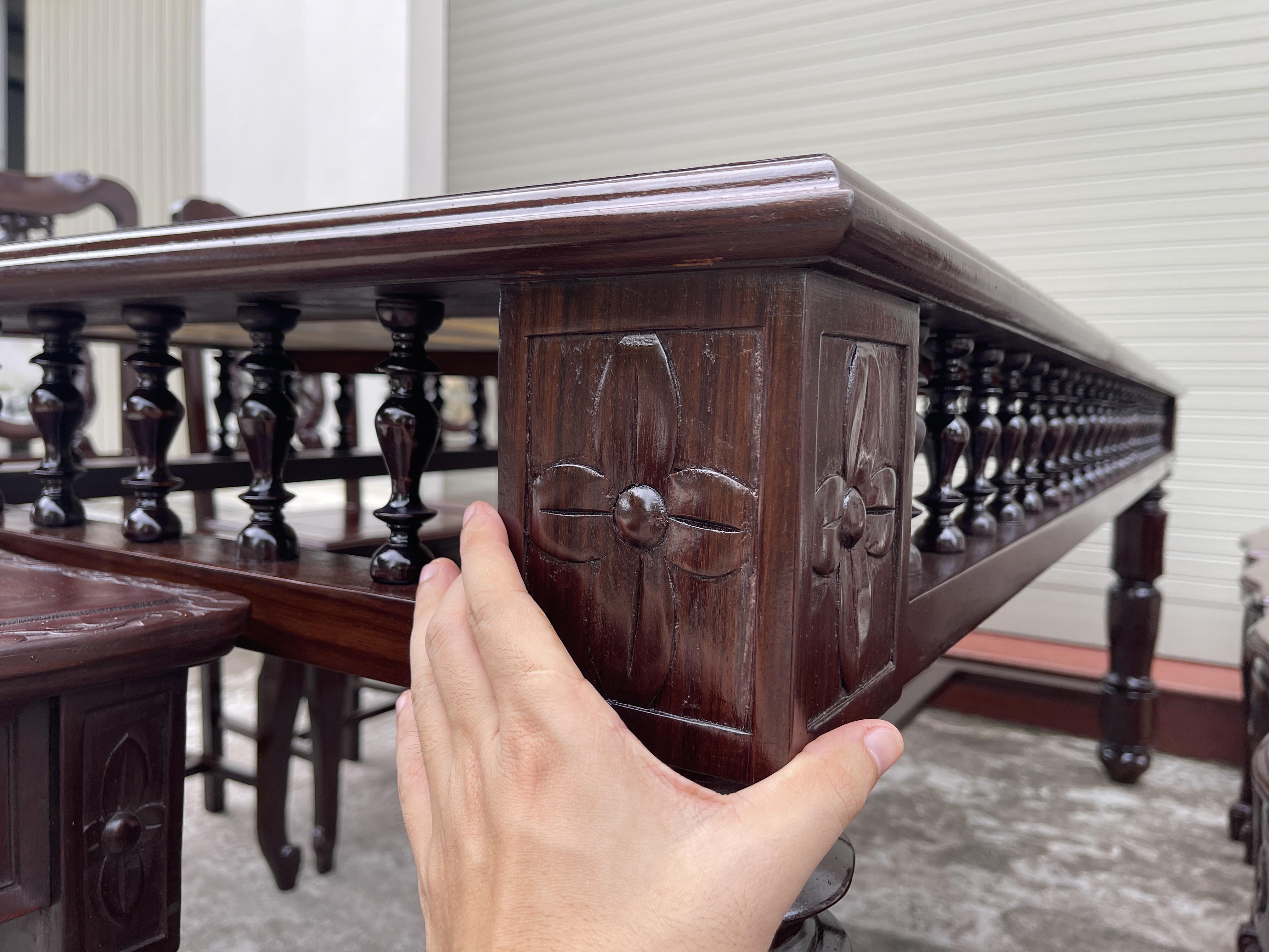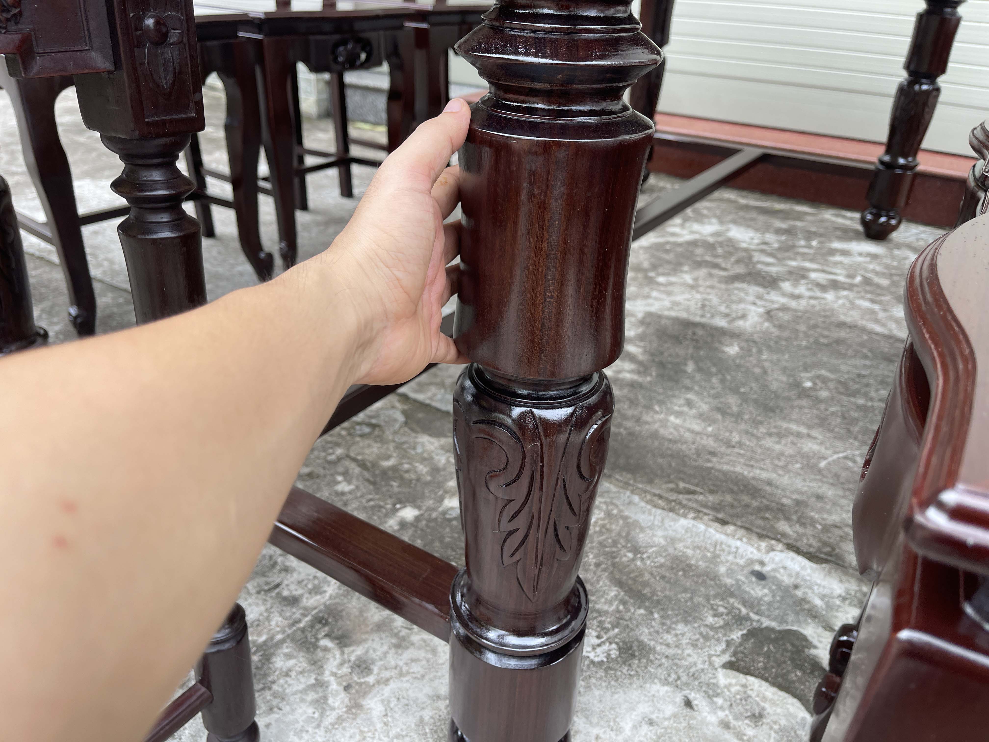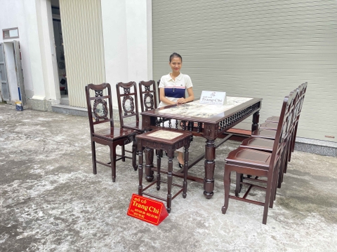 xin giới thiệu tới quý khách hàng mẫu bàn ăn rất tiện và sang sản phẩm Bộ Bàn Ghế Ăn 12 Món Bàn Chữ Nhật sau đây cơ sở chúng em giới thiệu mang kiểu dáng nổi bật mặt bàn chữ nhật mặt đá rộng làm bàn ăn để đồ cực thoải mái. DánG ghế có tựa ngồi thoải mái hoa văn được cơ sở chúng em đục chạm nổi bật và bắt mặt. Bộ bàn ăn nên tới 10 ghế 1 đôn có thể tiếp được nhiều vị khách nơi quây quần, thảo luận dùng tiệc. Bộ bàn ăn gỗ gụ bền không chỉ thể hiện được nét tịnh tế, độ bền cao còn là một món quà cao cấp dành tặng cho quý gia chủ rất đặc biệt và sang trọng