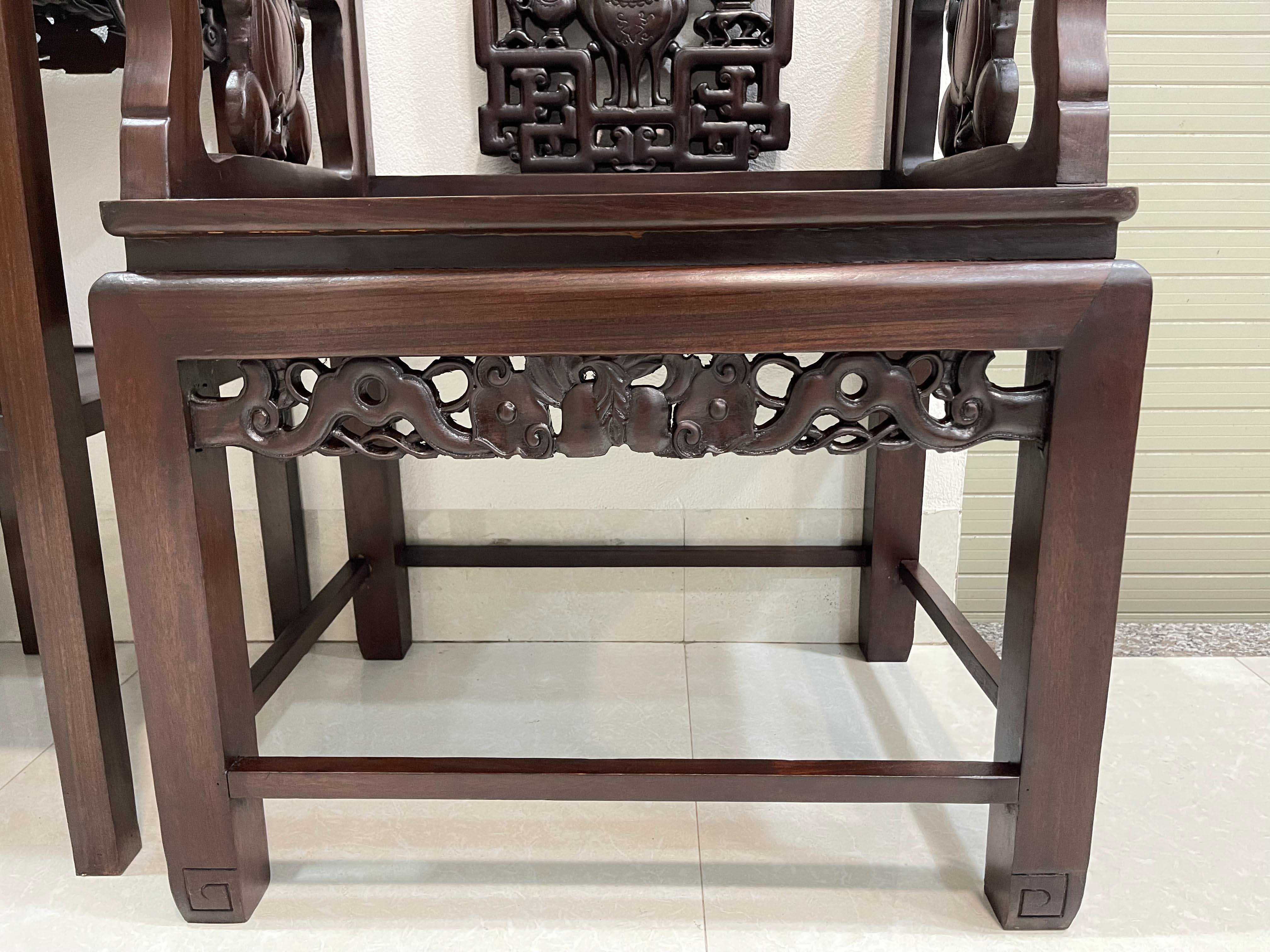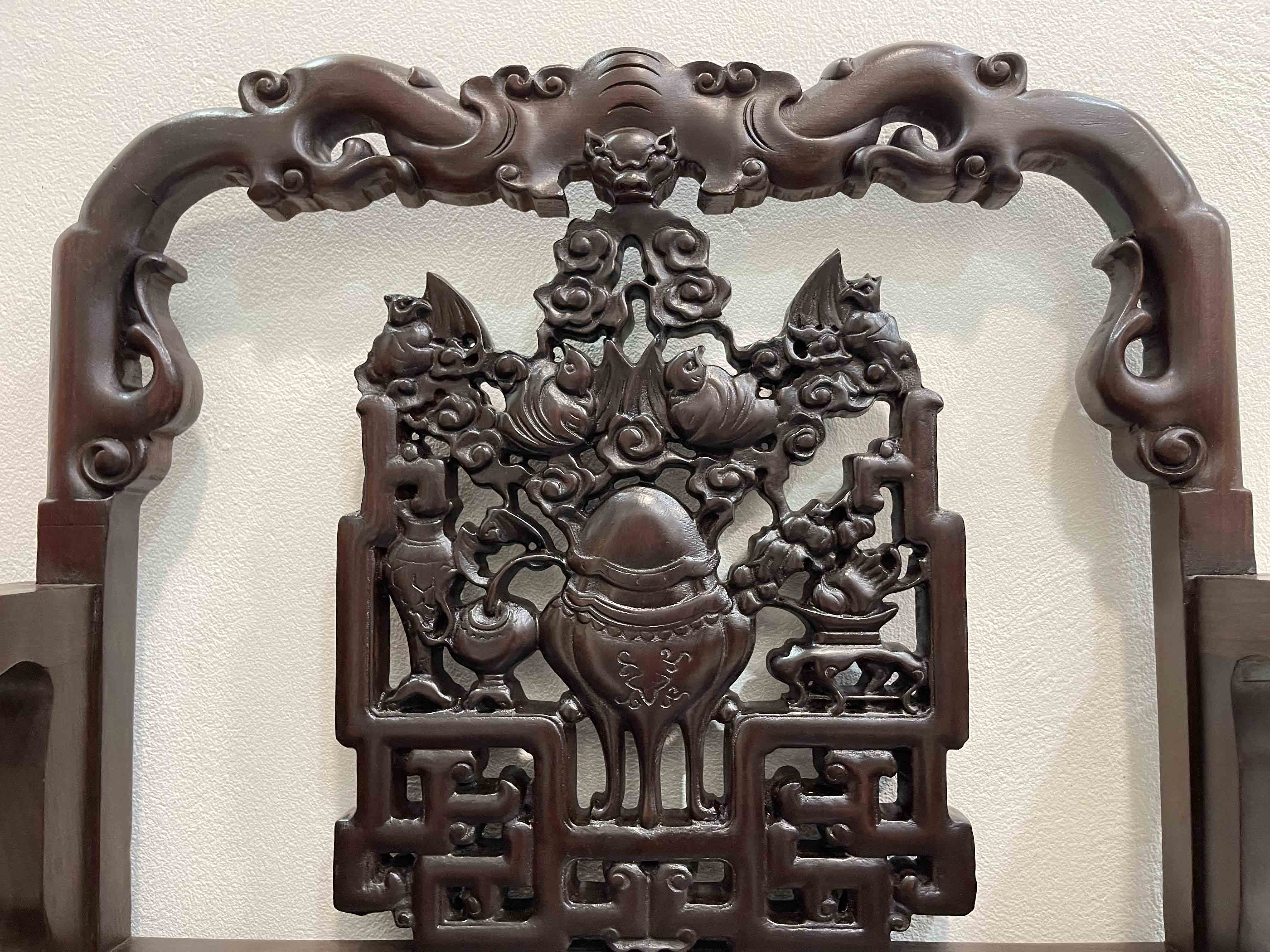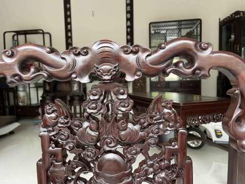 Chủ đề đục chạm trên bộ ghế là hình ảnh tựa đục lục bình hoa, đục chạm dơi, ốc, quả đào được đục chạm tỉ mỉ sắc nét, với những đường nét mềm mại và uyển uyển trên tựa, tay ghế, dạ bàn. Hình ảnh được lấy từ mẫu cổ thời cha ông để lại không chỉ kỹ thuật bộ ghế còn là một nét thẩm mỹ cao