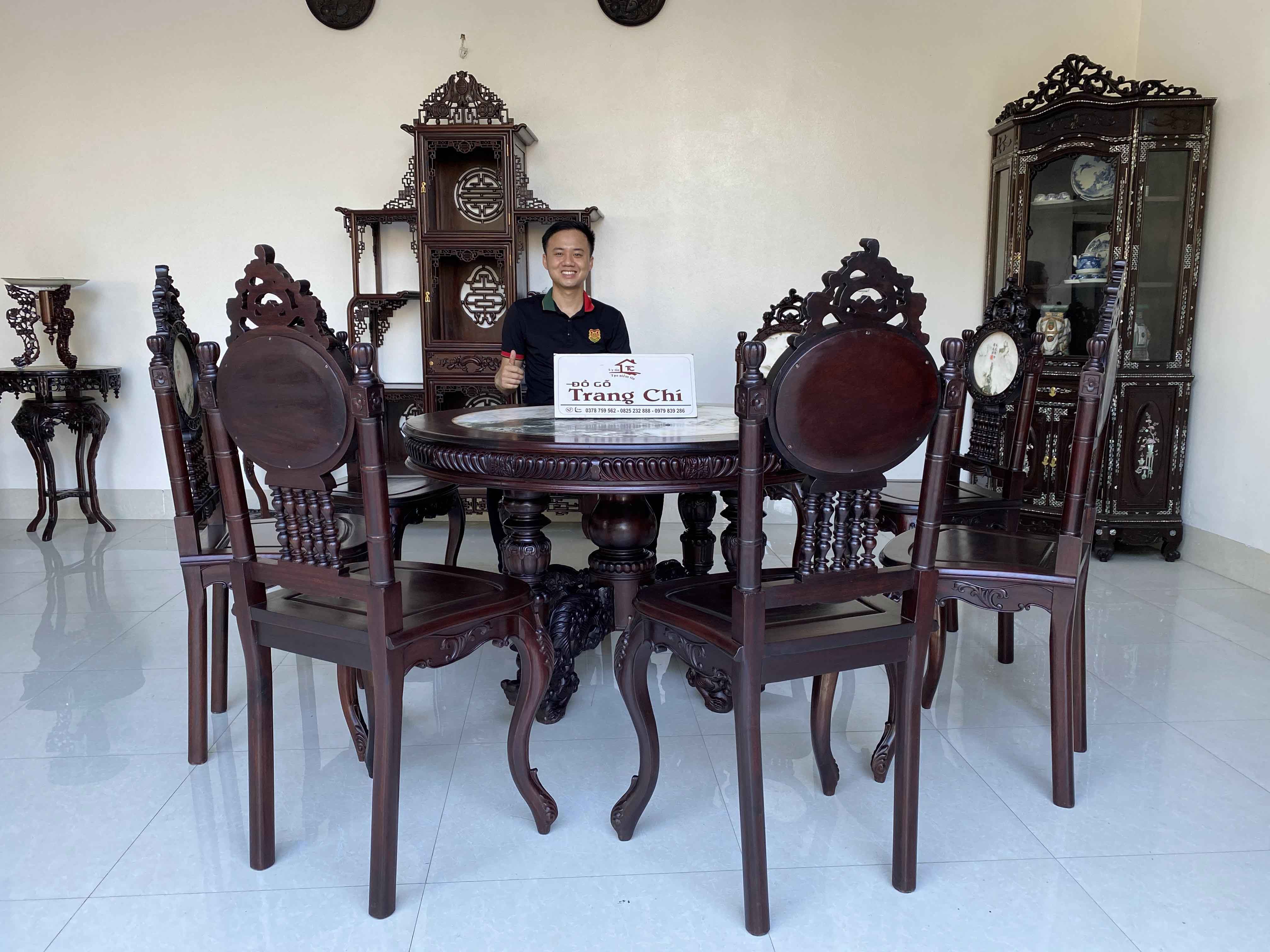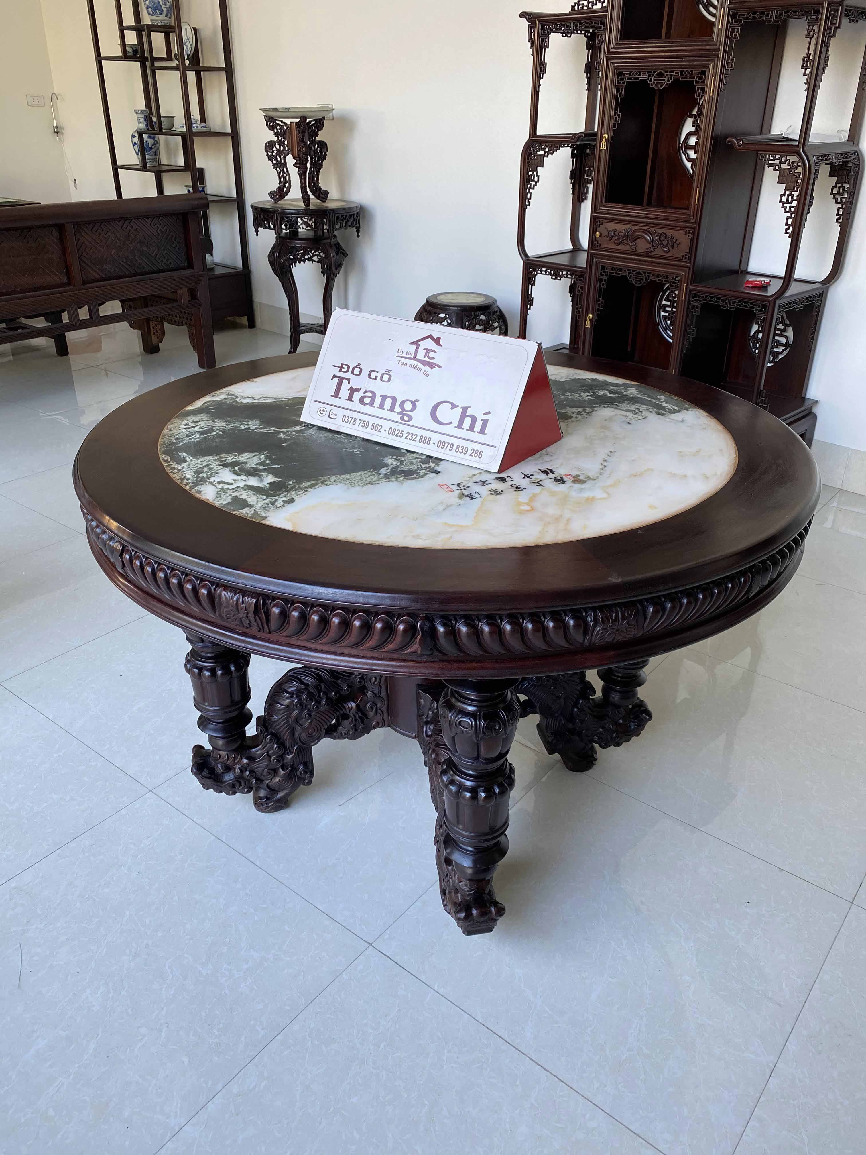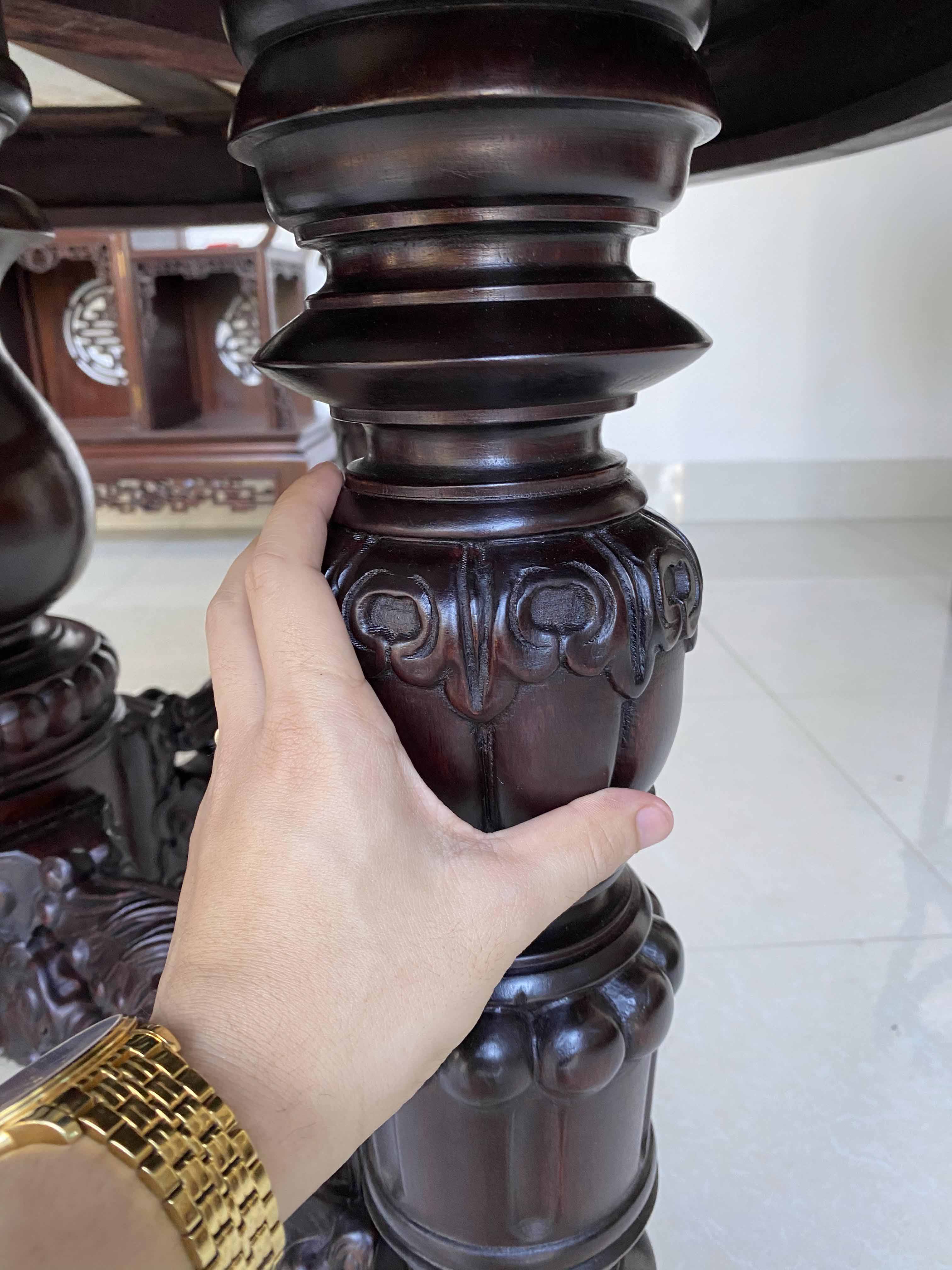 Với diện tích rộng từ 3,5 m2 vuông trở nên, kích thước bàn tròn rộng quý vị có thể để được rất nhiều đồ trên bàn này. Kiểu dáng ghế cong hơi hướng louis, bàn vững chắc chân kỳ lân còn là một bộ ghế rất thẩm mỹ và thể hiện được nét đục chạm nổi bật, quý phái cho không gian phòng