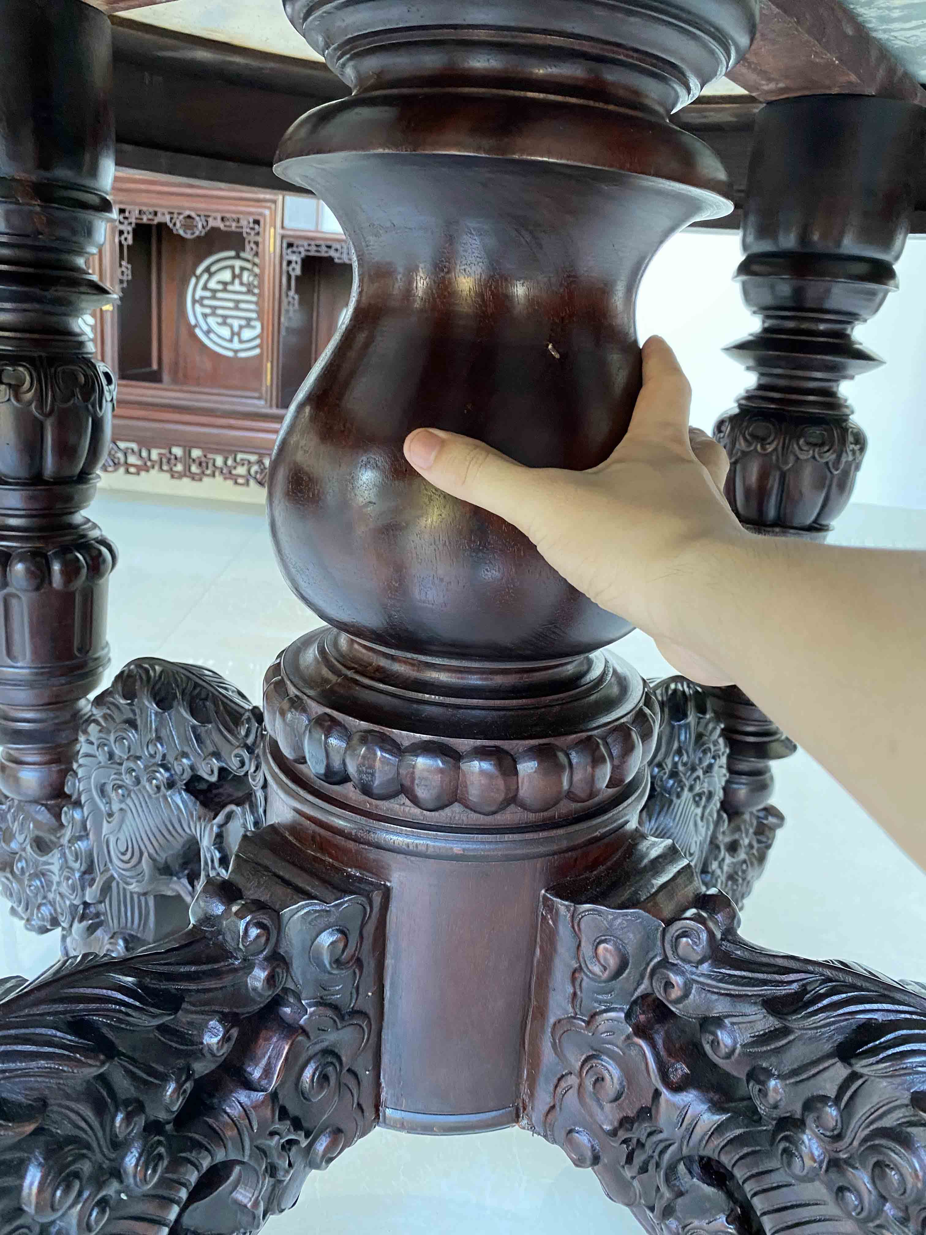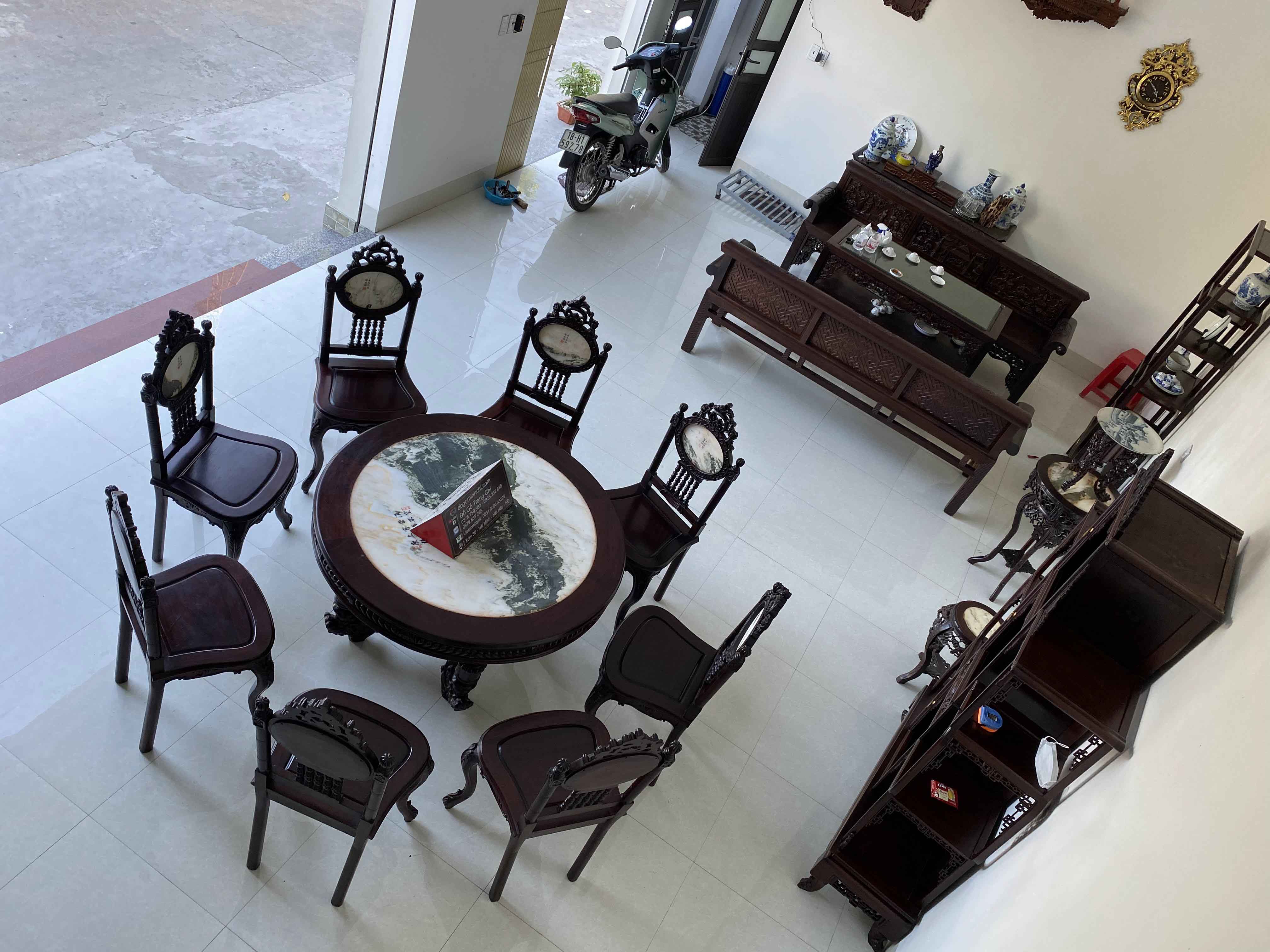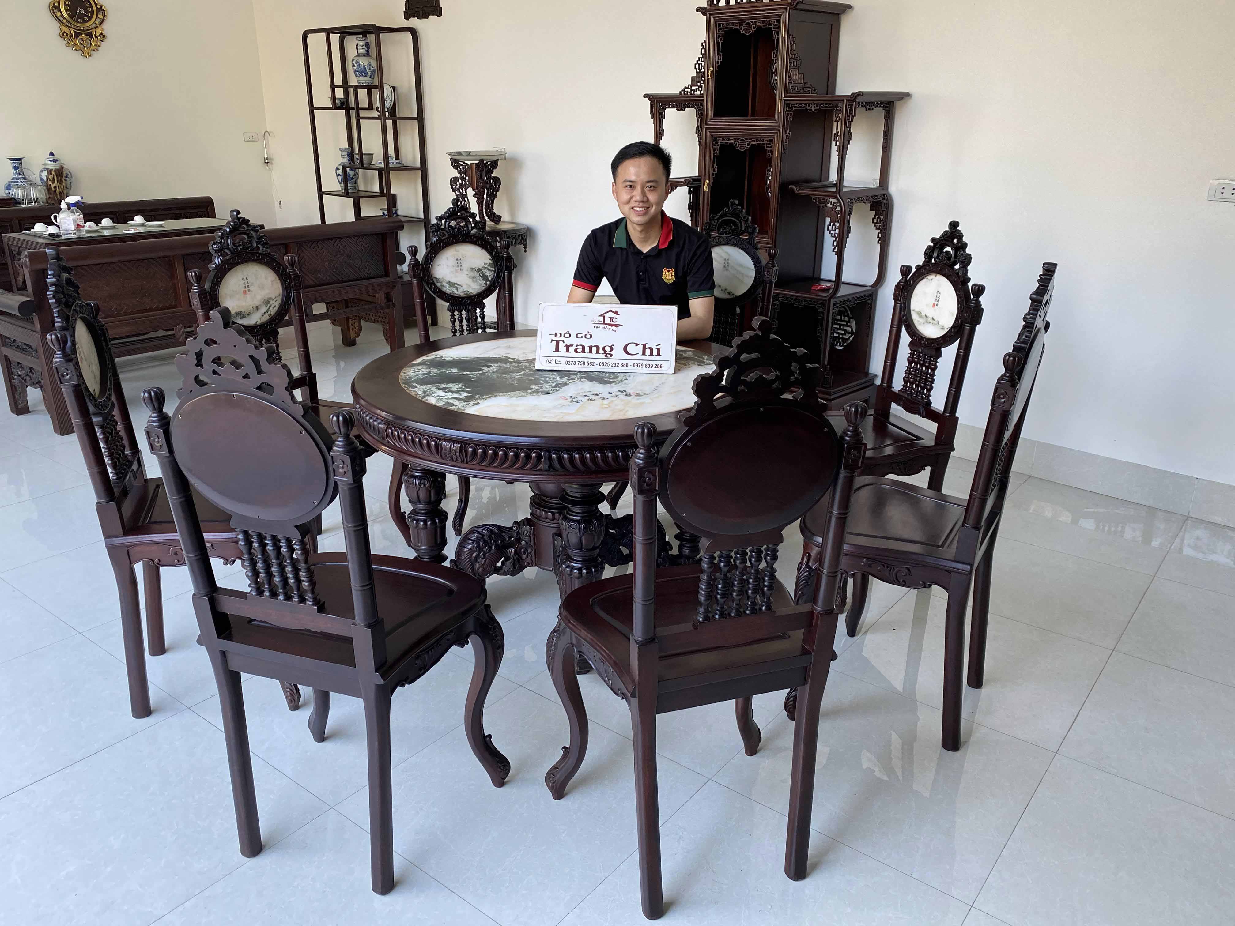 Với diện tích rộng từ 3,5 m2 vuông trở nên, kích thước bàn tròn rộng quý vị có thể để được rất nhiều đồ trên bàn này. Kiểu dáng ghế cong hơi hướng louis, bàn vững chắc chân kỳ lân còn là một bộ ghế rất thẩm mỹ và thể hiện được nét đục chạm nổi bật, quý phái cho không gian phòng