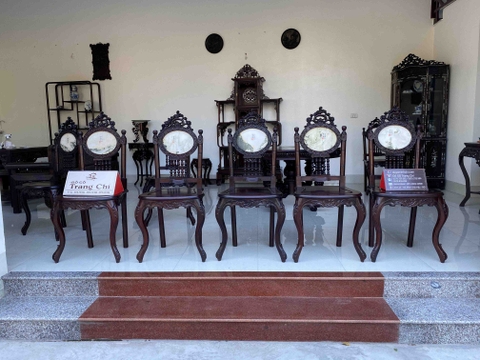 Ghế với dáng chân cong, mềm mại, tựa ghế với một viên đá vân mây rất nổi bật, tạo điểm nhấn. Hình ảnh hoa lá tây vân đá kết hợp với những con tiện lối Huế. Đặc biệt ghế được chúng tôi làm mộng cùng gỗ gụ nên cảm giác khi ngồi vũng trắc. Khâu làm nguội nên màu được trà nhám kỹ lưỡng, màu vécni lối cổ