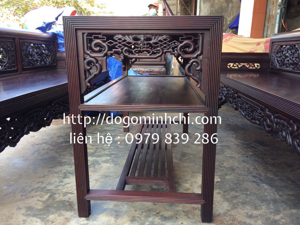 Bộ gồm 3 món gỗ gụ ,các đường ren chạy chỉ thẳng tắp phải nói là thợ giỏi mới đủ tài năng để làm lên sản phẩm đẹp như thế này.Bác nào cầnhần điêu khắc rất có hồn nên không bị rối reng khung cảnh các quan công thời phong kiến xưa được các nghệ nhân làng nghề chúng tôi miêu tả qua những mũi đục hết sức công phu tỉ mỉ .