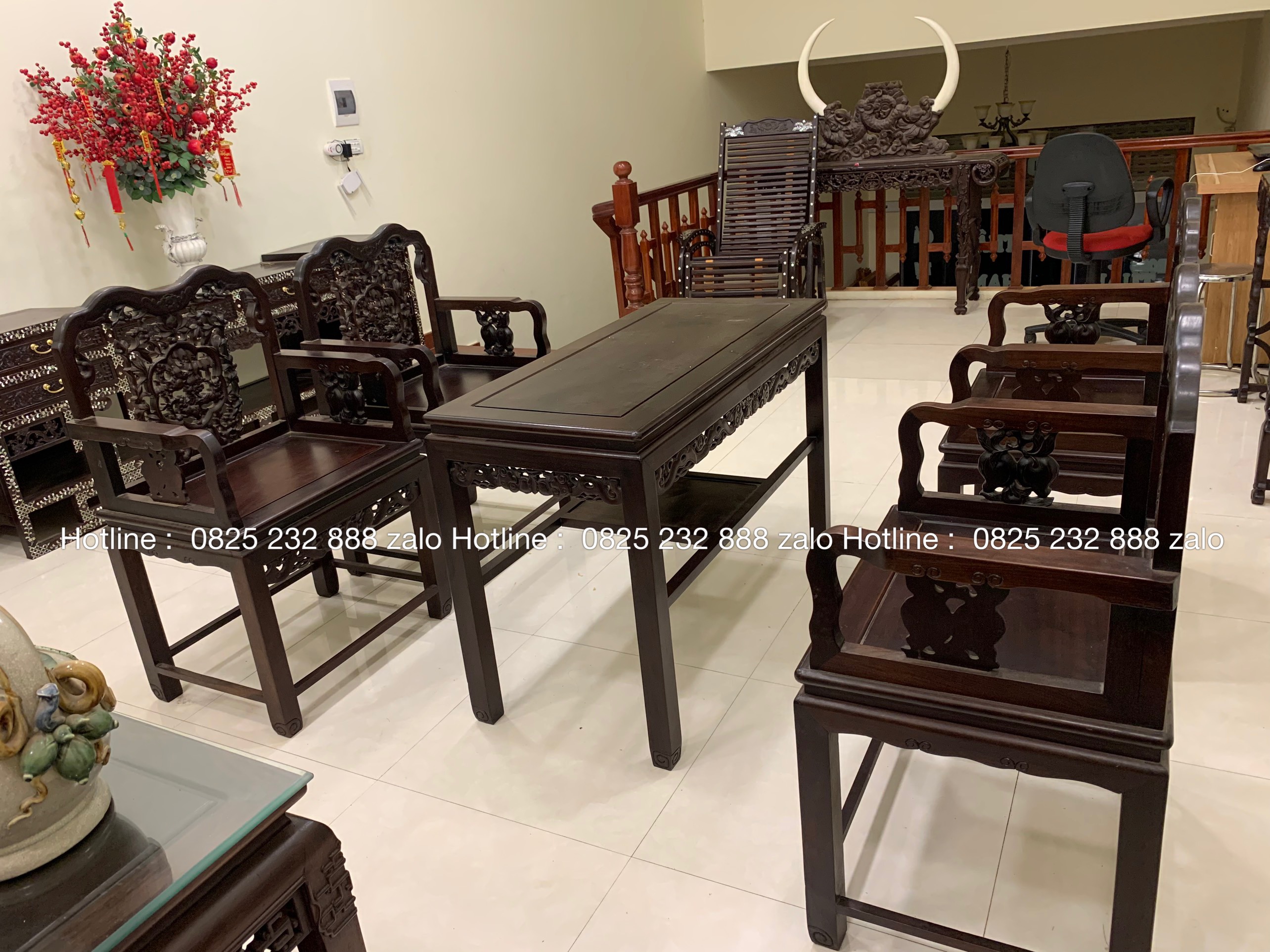Bộ bàn ghế vách chạm lân phù hợp với không gian phòng khách cỡ vừa và nhỏ. Bộ vách lại mang một vẻ nét đẹp lạ, thích hợp với những gia đình yêu thích sự mộc mạc nhẹ nhàng.