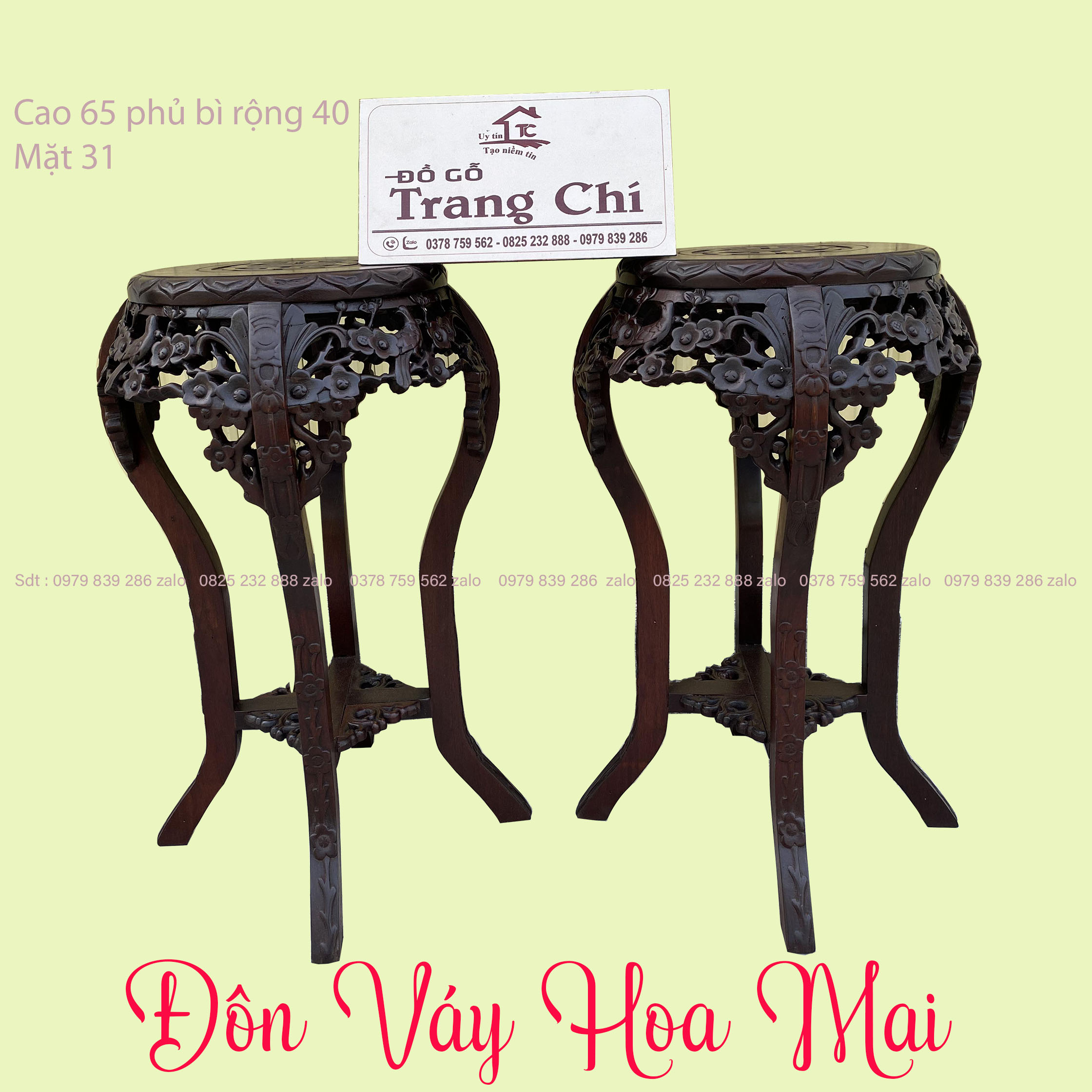 Các sản phẩm đôn gỗ điển hình như đôn tròn đôn vuông luân đem lại giá trị, sự tiện dụng, cùng nét đục chạm lôi cuốn. Luân là sản phẩm được tìm kiếm mua nhiều, tính ưu việt không chỉ thẩm mỹ còn giúp sản phẩm trưng bày thêm phần cao, dễ nhìn, và nổi bật hơn. Đôn Kệ Váy Hoa Mai là một mẫu đôn váy tròn được làm mềm mại và thánh thoát, nét đục chạm hoa mai điểu lối cổ vanh thoáng, nét đặc trưng duyên dáng