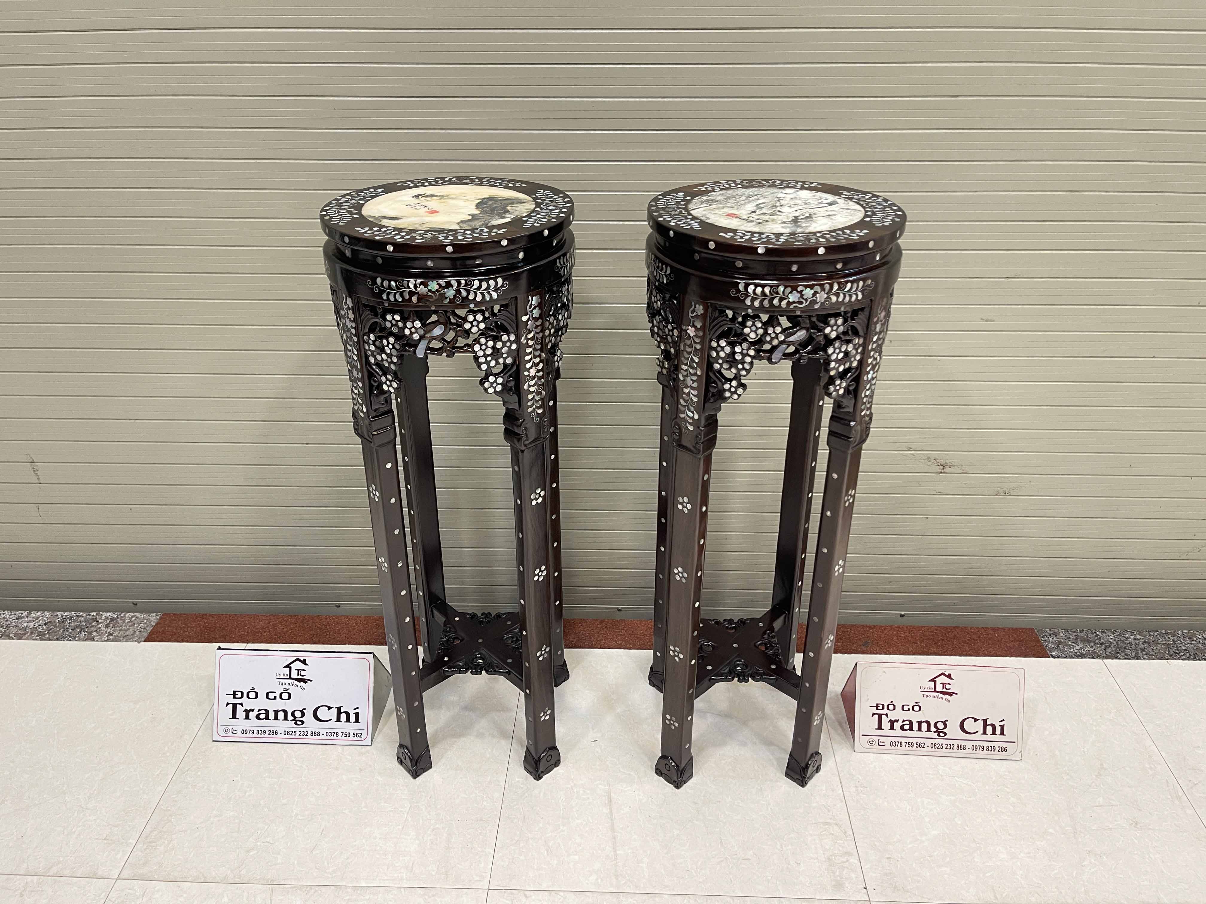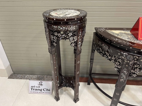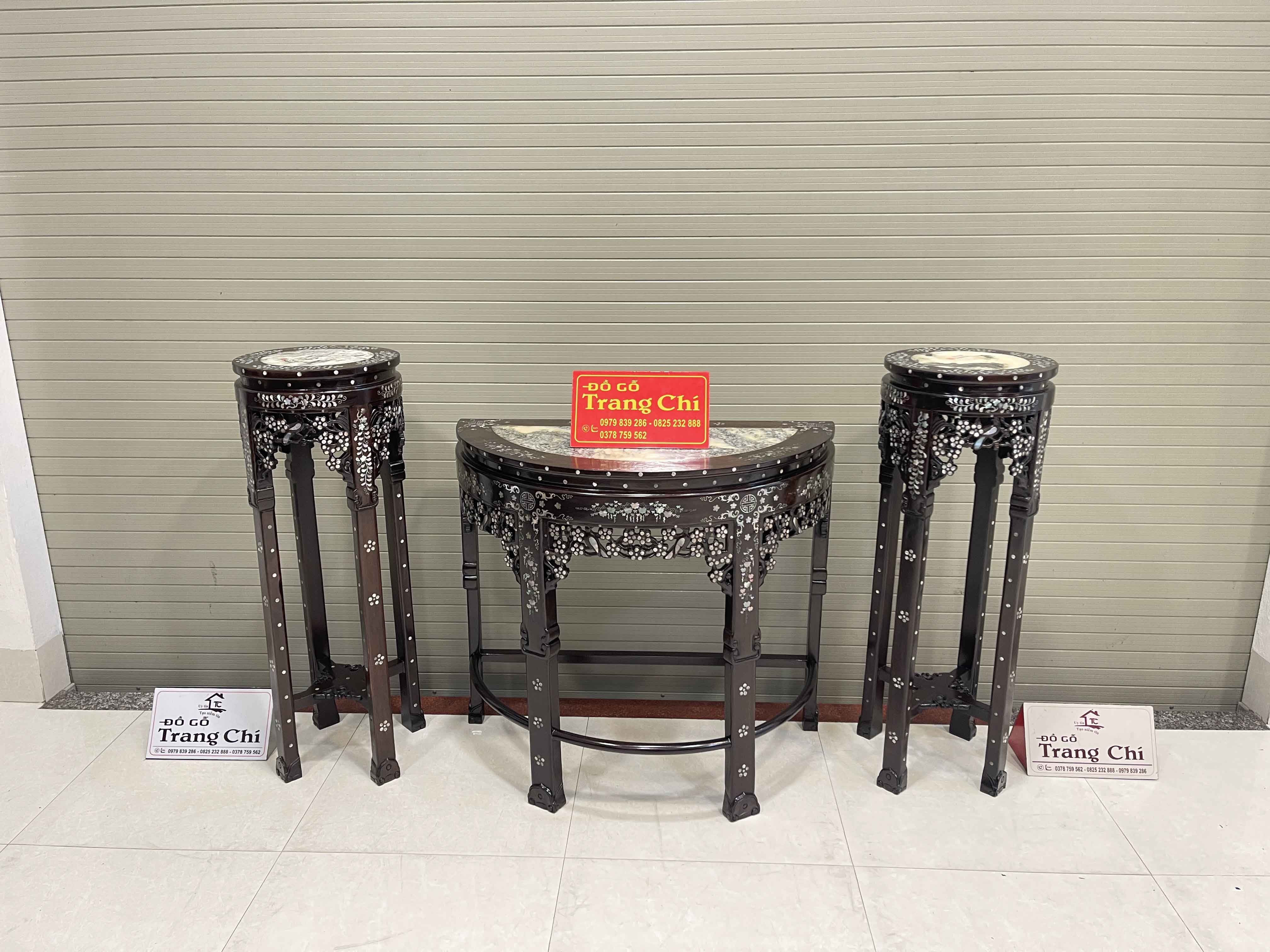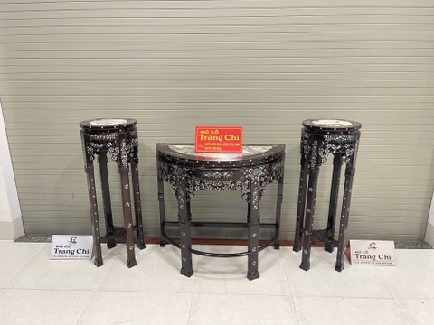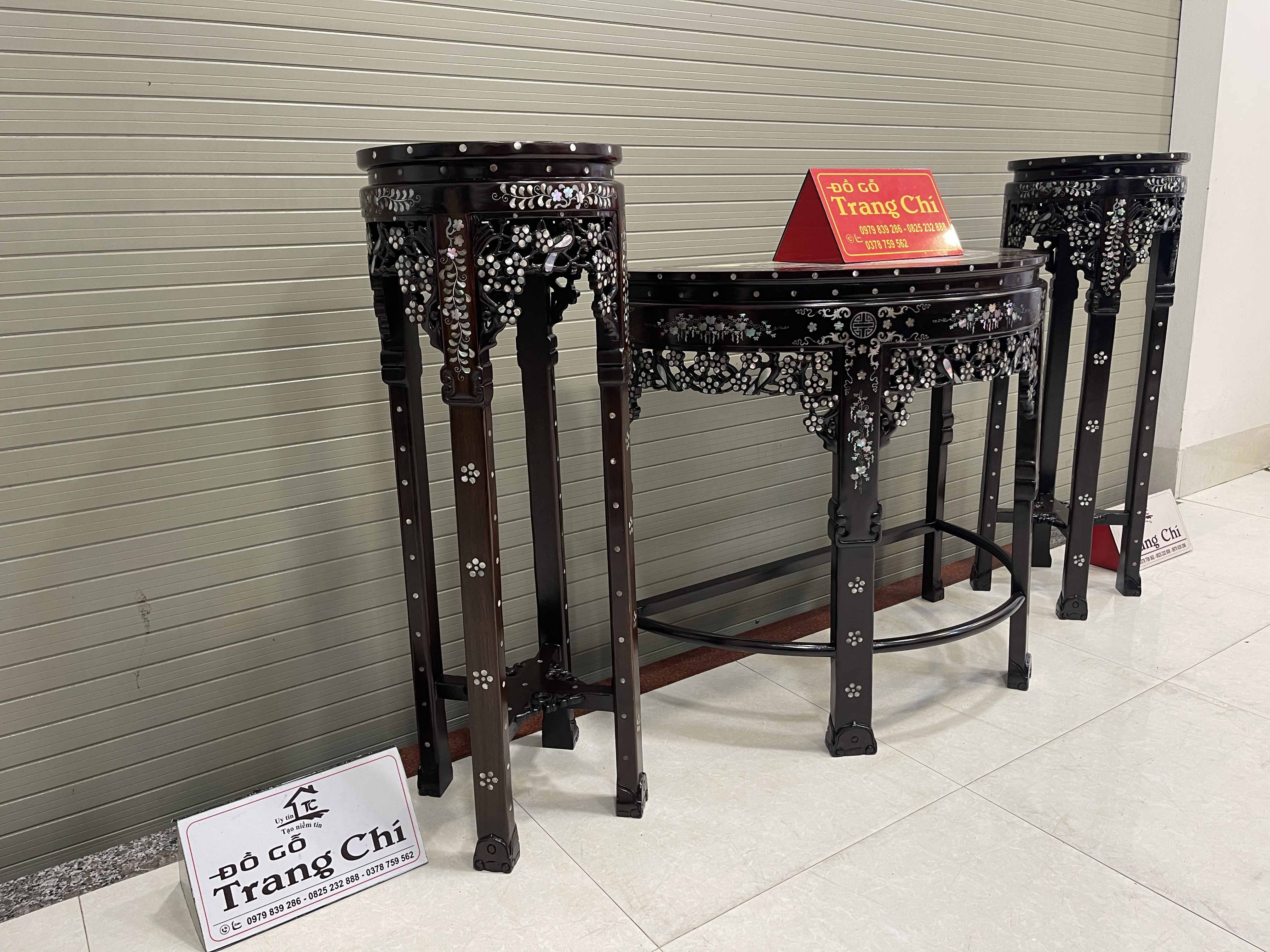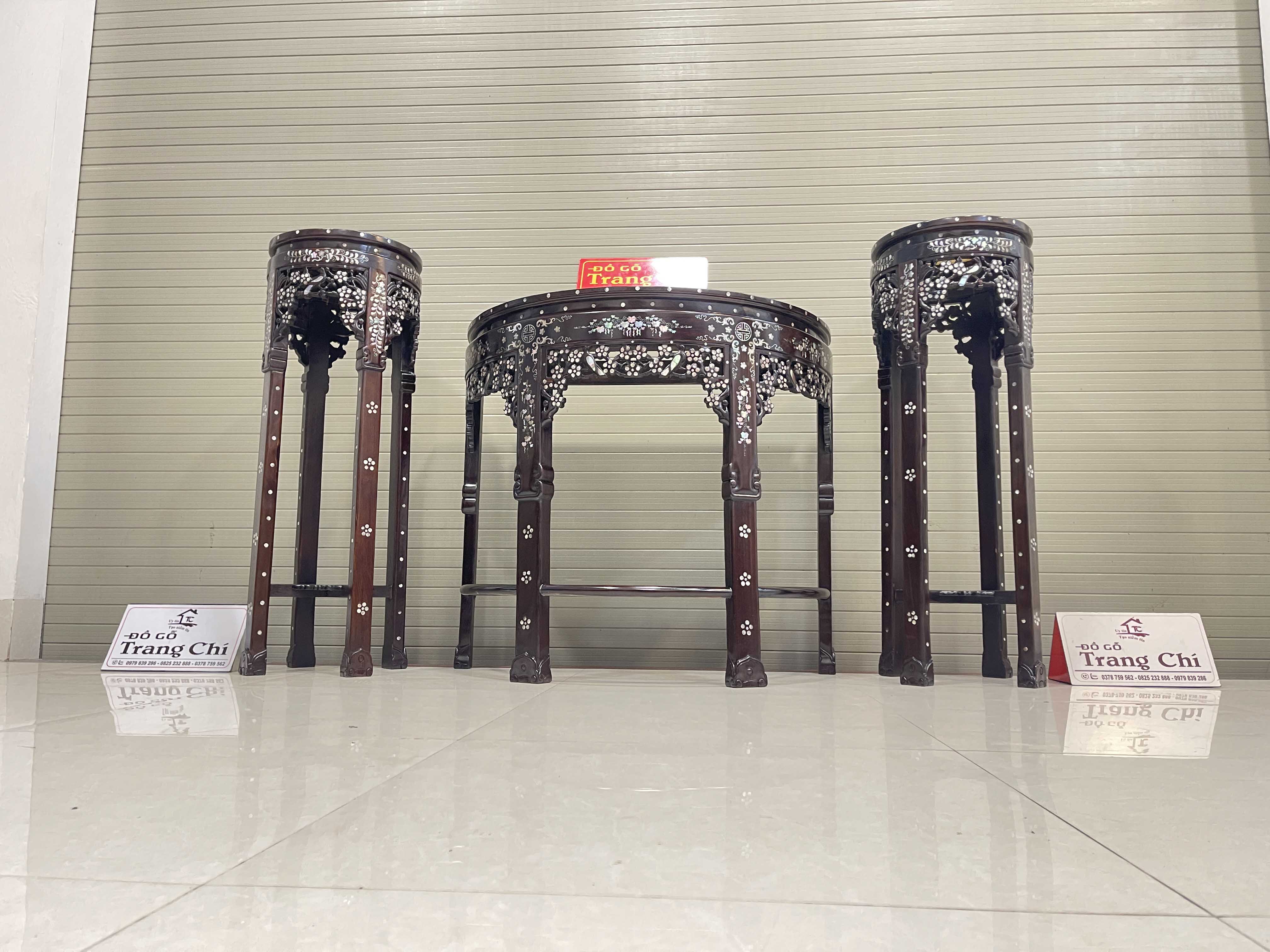 xin giới thiệu tới quý khách hàng mẫu Bàn Và Đôn Tròn Bày Đồ Kết Hợp rất nổi bật sang trọng. Chất liệu gỗ gụ được cơ sở đục chạm theo hình ảnh mai điểu kết hợp cùng nghệ thuật cẩn ốc, cẩn trai nổi bật và sang trọng. Kiểu dáng bàn mặt nguyệt rộng kê áp tường dáng đôn cao tròn. Bộ gồm 3 món giúp những sản phẩm được trưng bày được cao, giá trị hơn. Dưới đây là hình ảnh thông tin chi tiết về sản phẩm