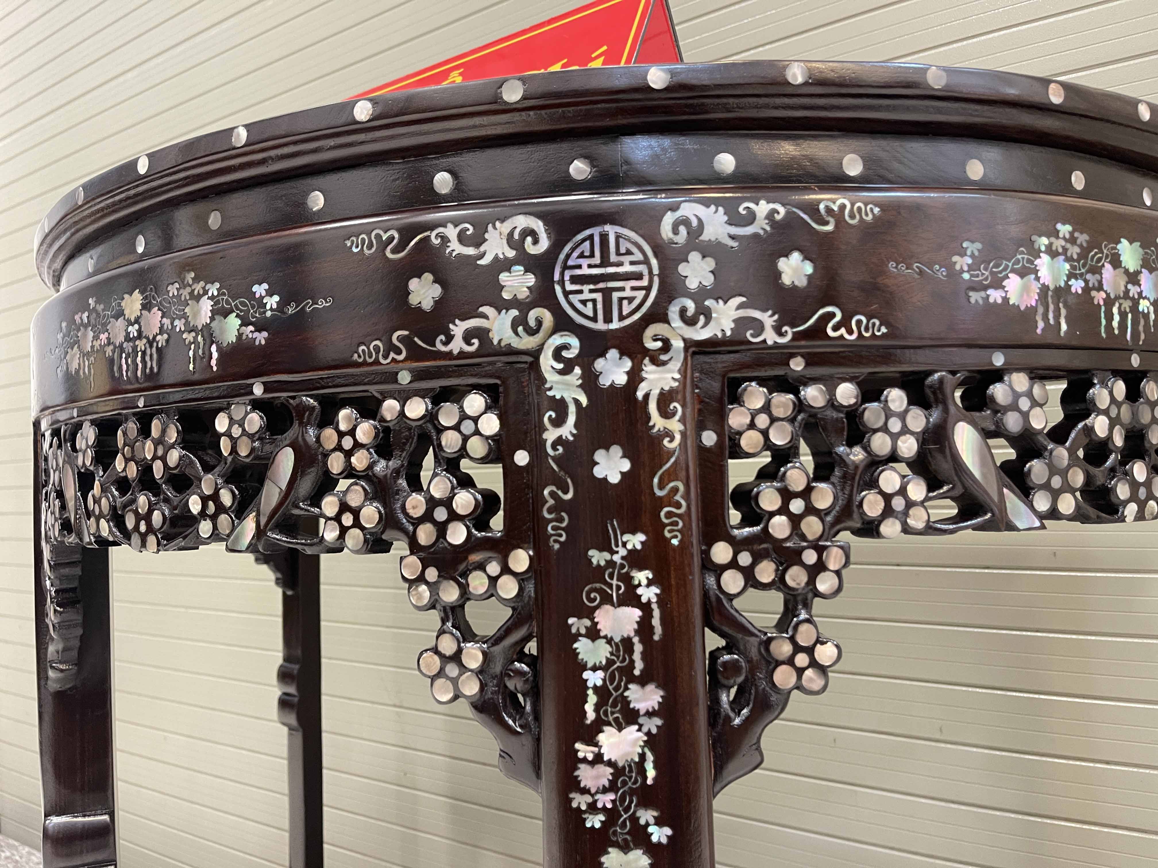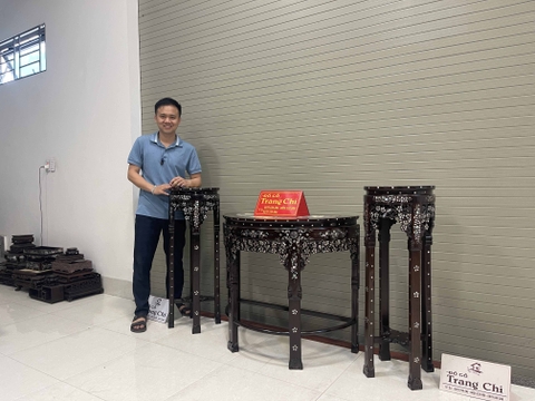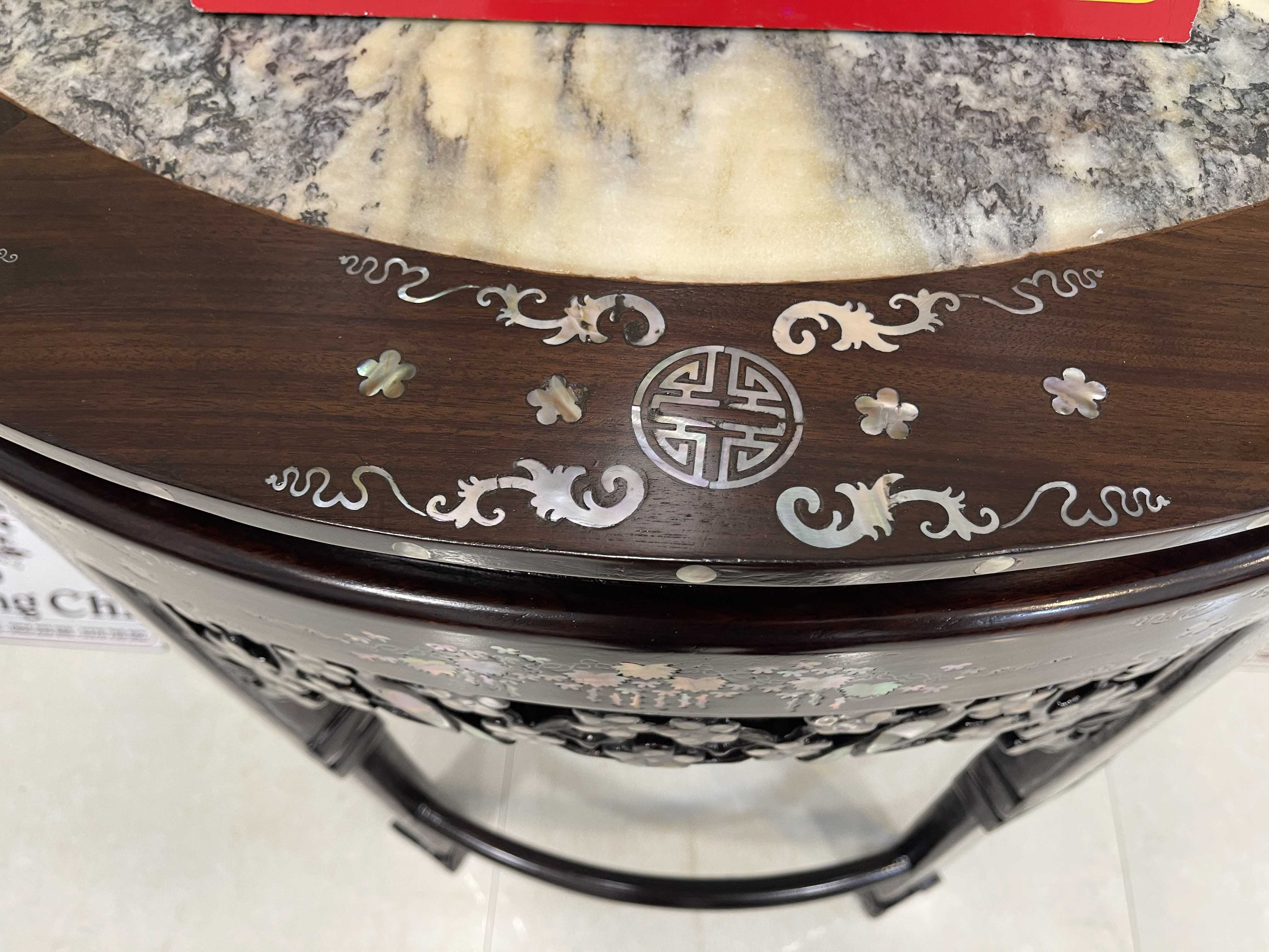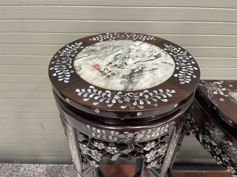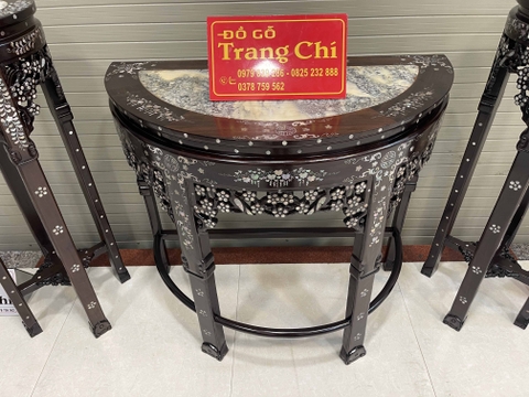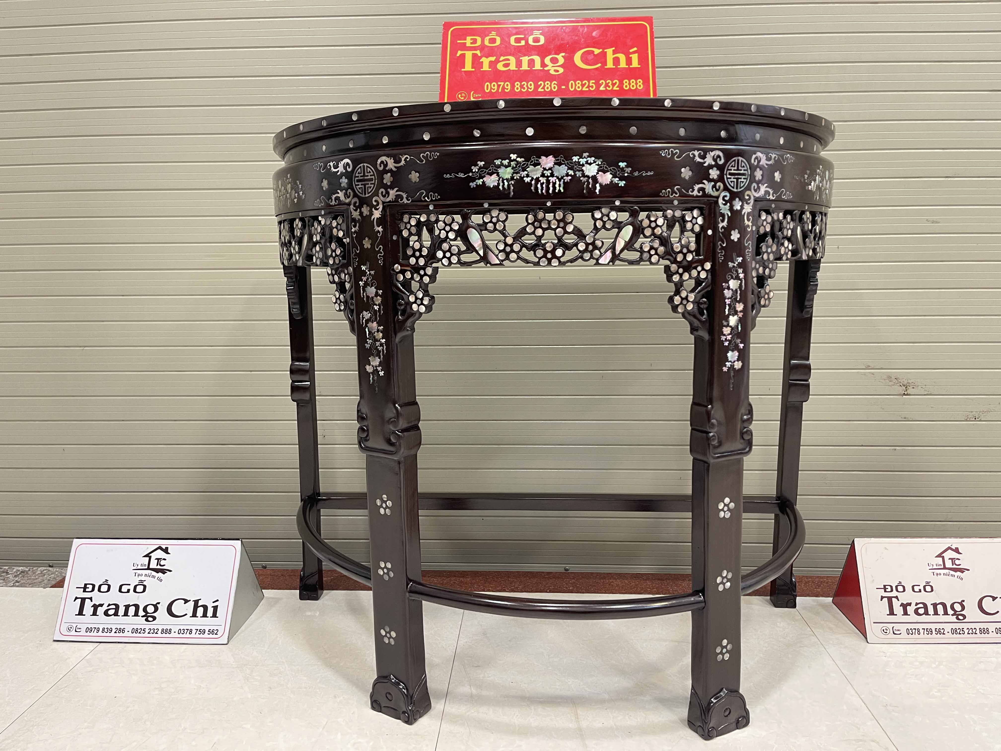 xin giới thiệu tới quý khách hàng mẫu Bàn Và Đôn Tròn Bày Đồ Kết Hợp rất nổi bật sang trọng. Chất liệu gỗ gụ được cơ sở đục chạm theo hình ảnh mai điểu kết hợp cùng nghệ thuật cẩn ốc, cẩn trai nổi bật và sang trọng. Kiểu dáng bàn mặt nguyệt rộng kê áp tường dáng đôn cao tròn. Bộ gồm 3 món giúp những sản phẩm được trưng bày được cao, giá trị hơn. Dưới đây là hình ảnh thông tin chi tiết về sản phẩm