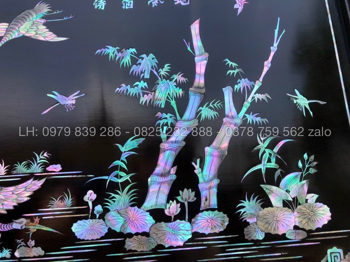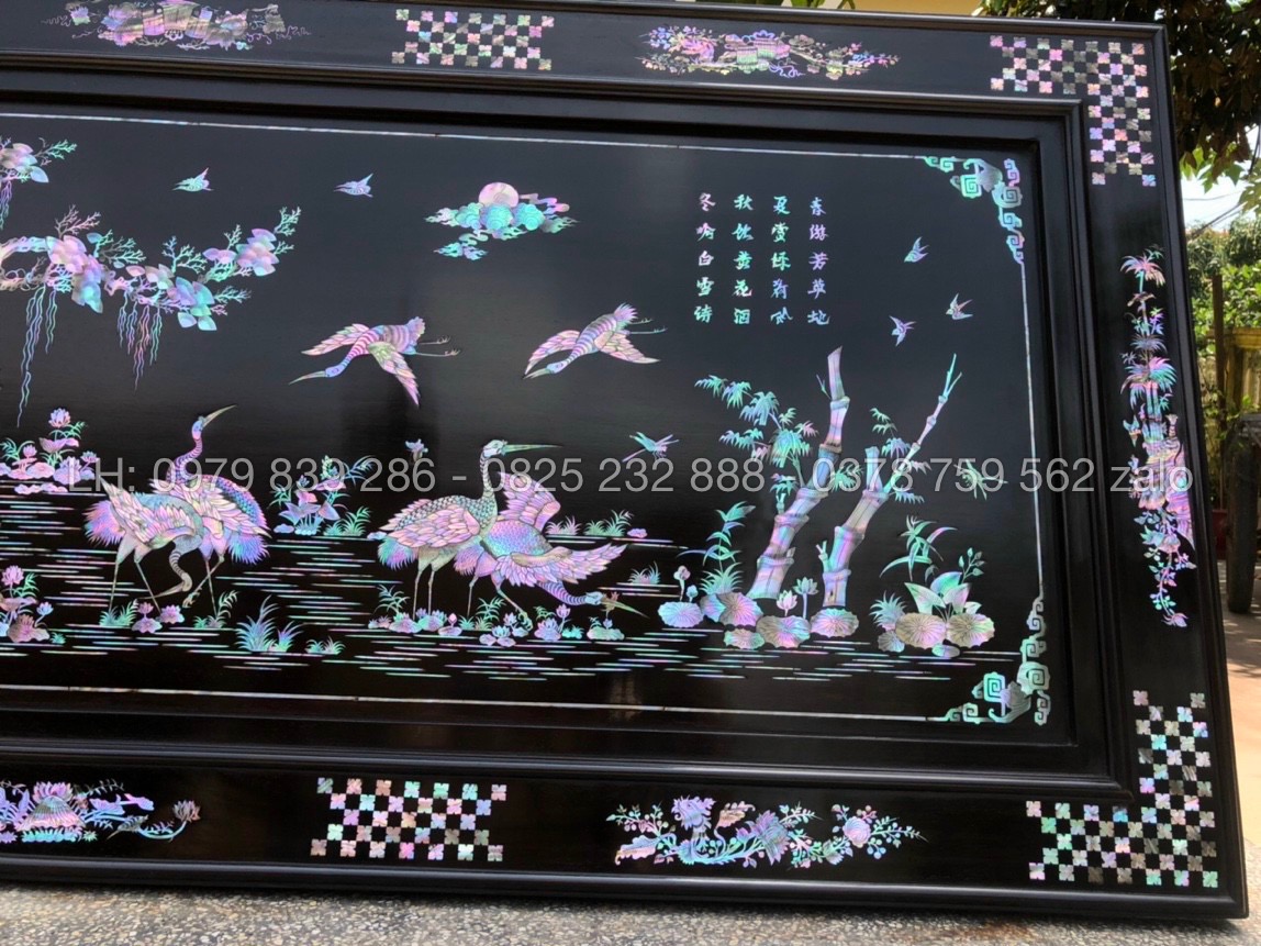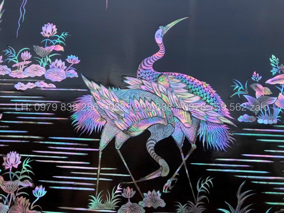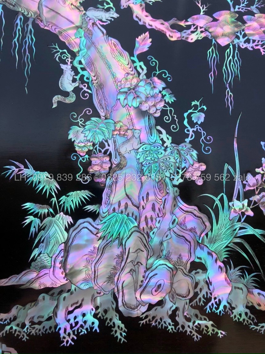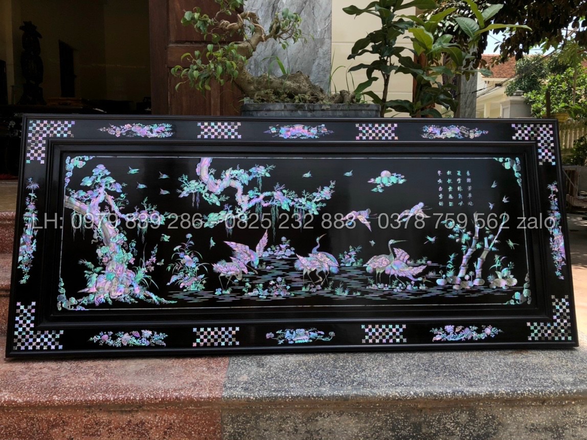 Hãng: Đồ Gỗ Minh ChíTranh Tùng Hạc Khảm Ốc Tự Nhiên Rất Đẹp Sáng với chất liệu khảm ốc xanh, ốc đỏ, ốc hồng, ốc vàng, khảm trai