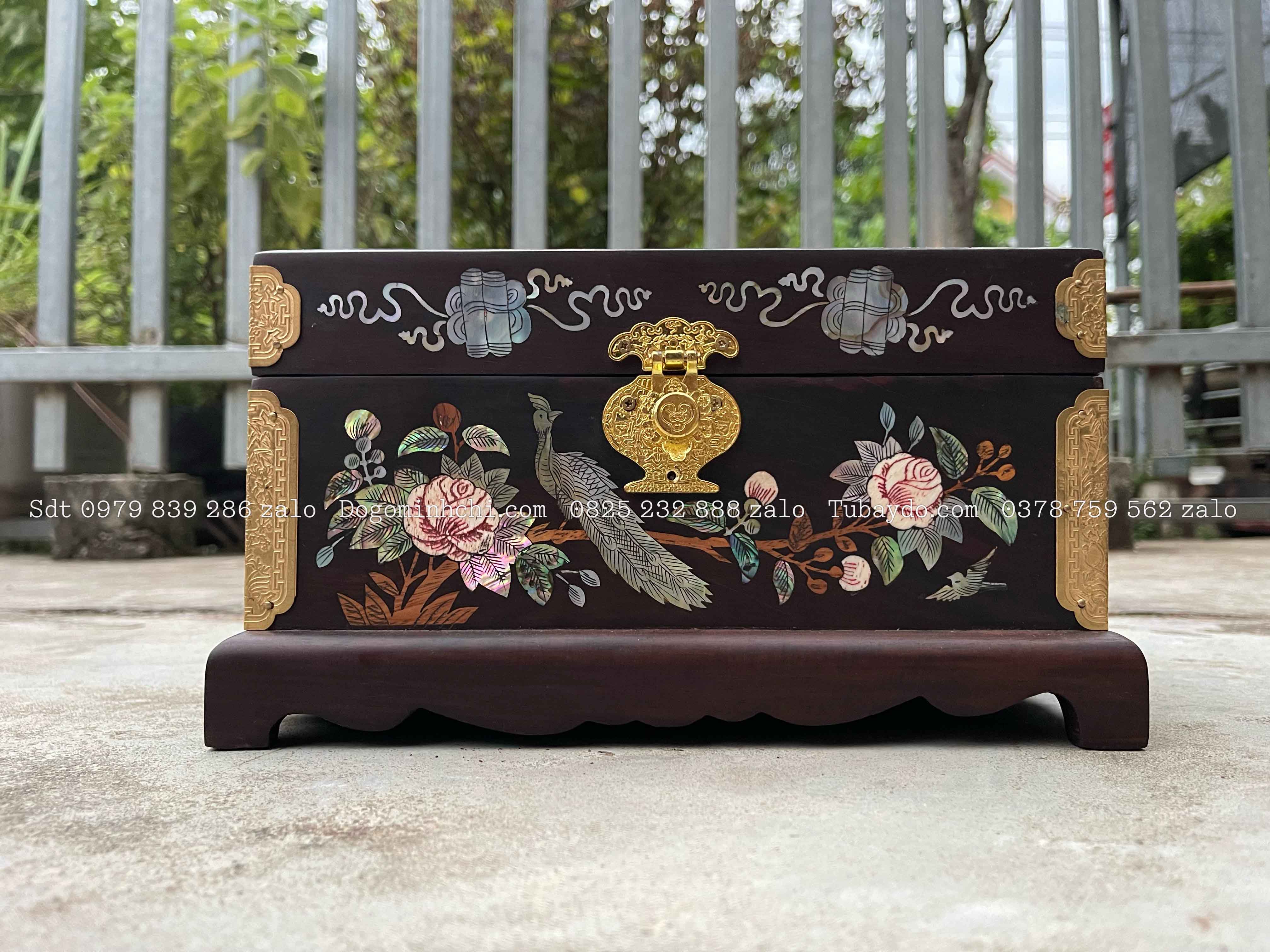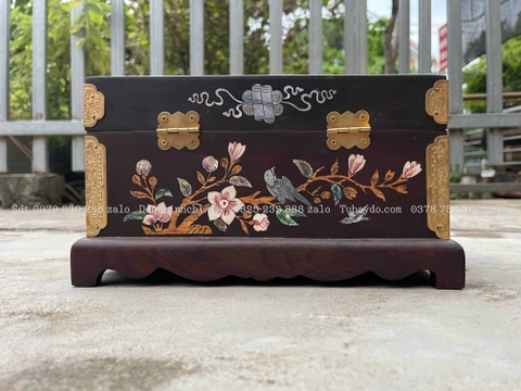 sản phẩm tráp khảm, được khảm từ nguyên liệu ốc tự nhiên,khảm gỗ xưa, khảm xưởng được người nghệ nhân khắc họa hoa văn, cắt tỉa sắc, ngọt trên nền gỗ trắc. Một bức tranh khảm chim hoa tứ diện giúp các mặt chiếc tráp đều nổi bật