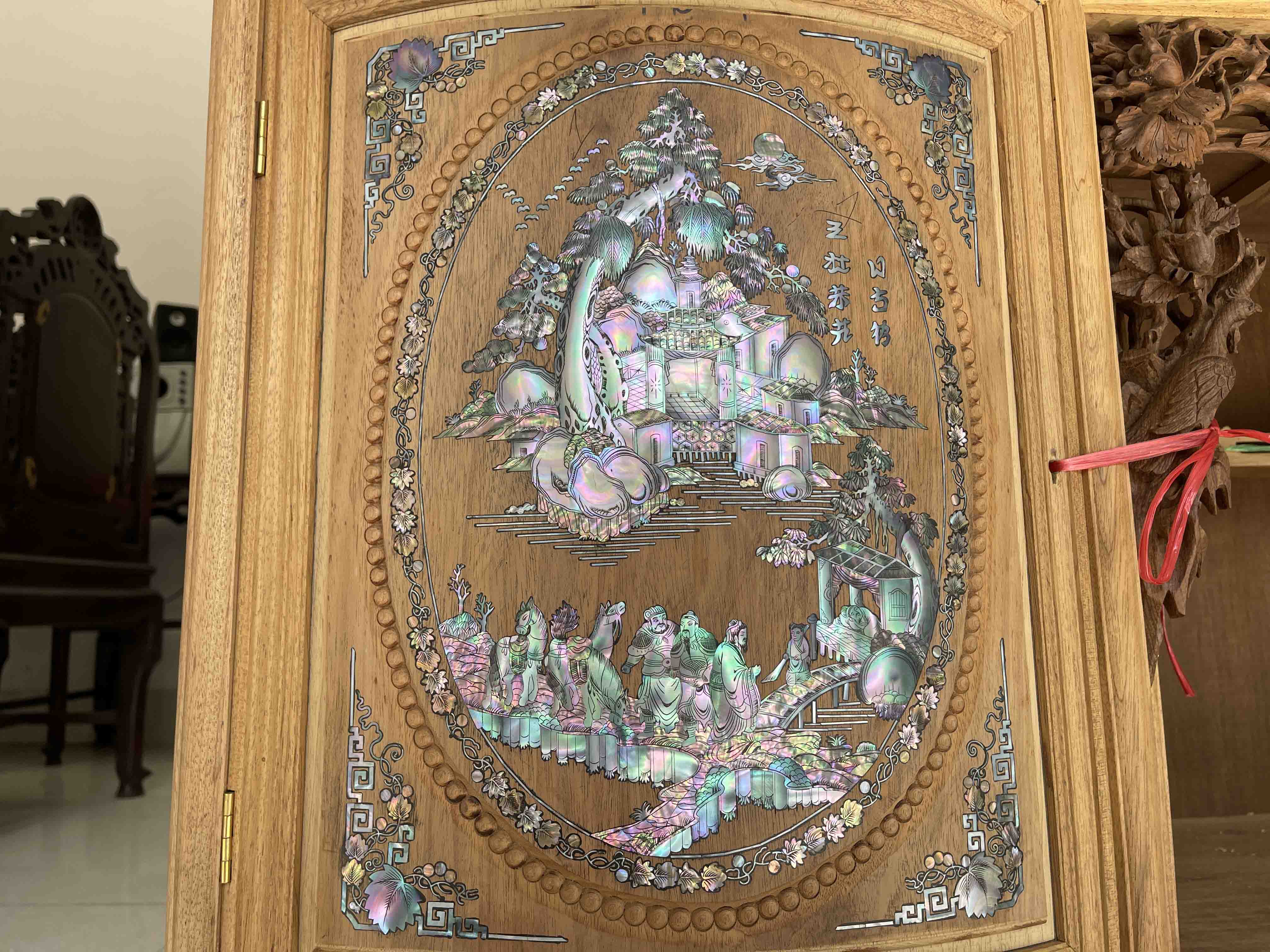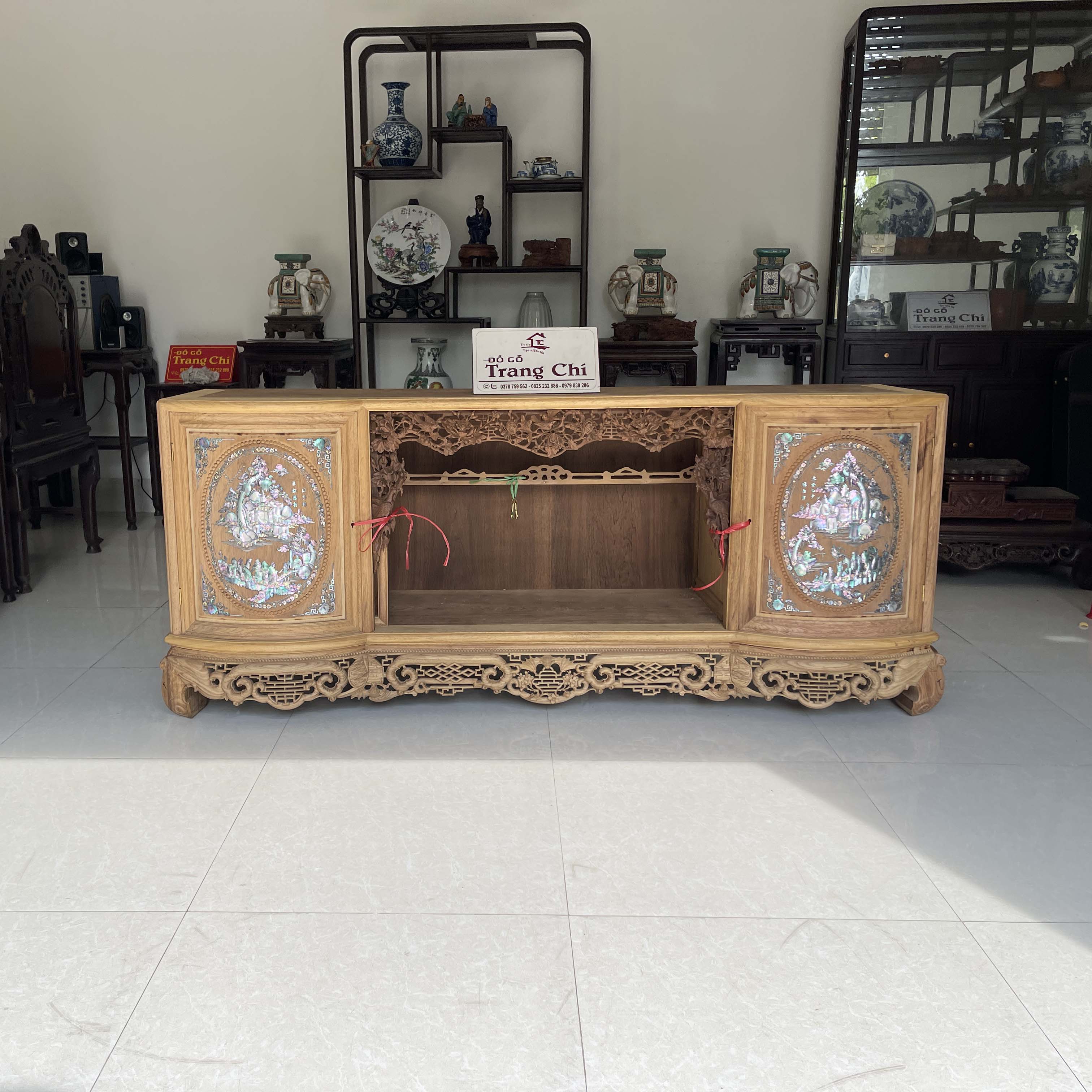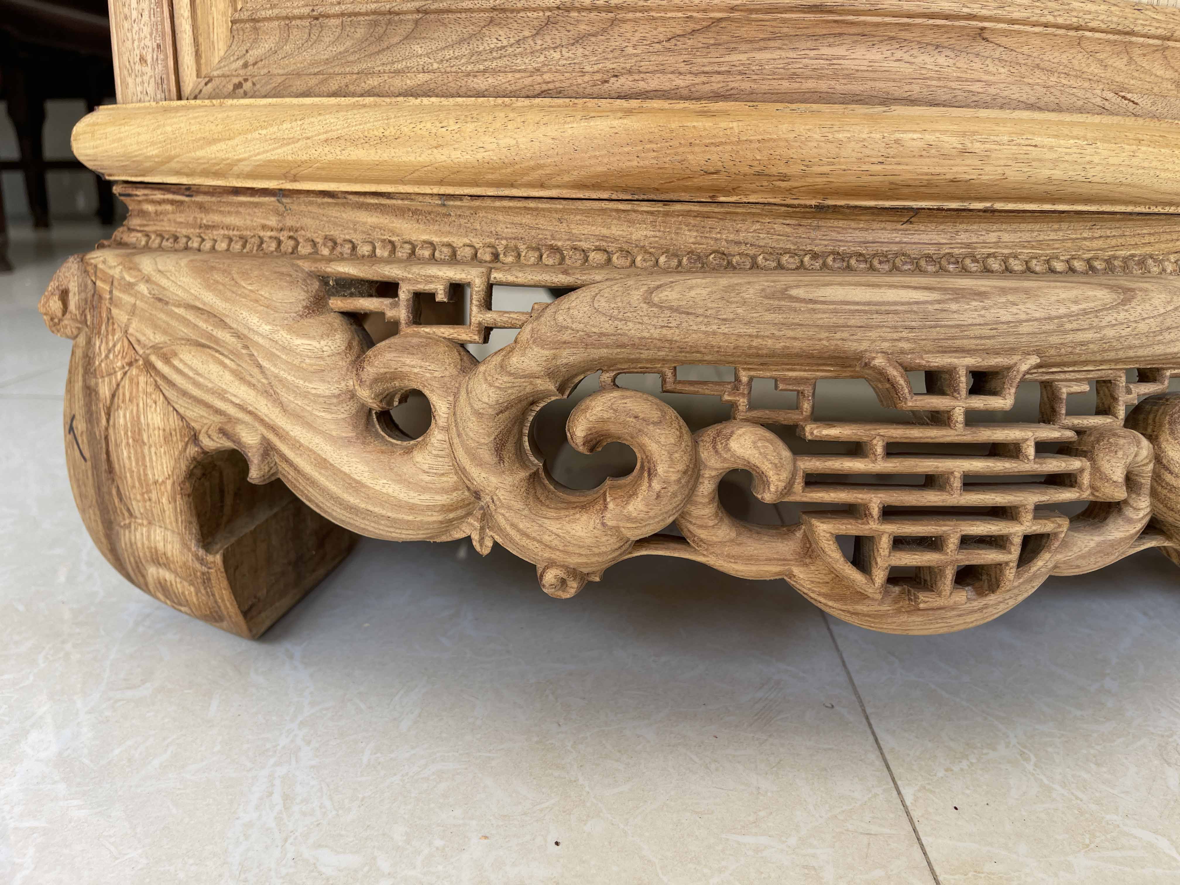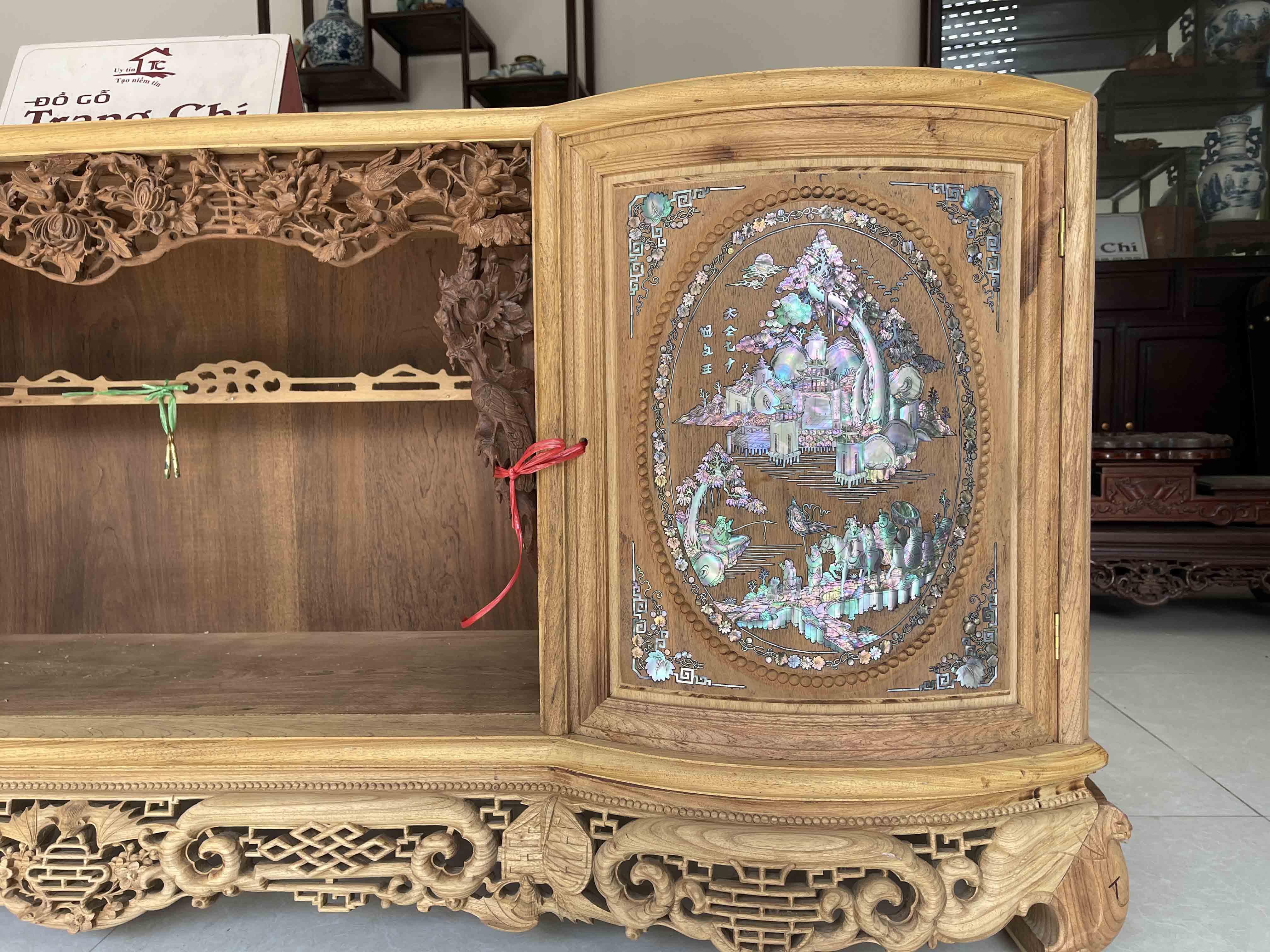 xin giới thiệu tới quý khách hàng mẫu tủ chè cánh cong khảm văn vương gỗ gụ để mộc trần khi trưa hoàn thiện si sáp.Qúy khách có thể xem trực tiếp mộc trước khi cơ sở hoàn thiện với nét đục chạm nổi bật, kênh bong tỉ mỉ từng nét đục chạm được người nghệ nhân thể hiện rất chau chuốt nổi bật. Dưới đây là hình ảnh cà thông tin chi tiết rõ nét nhé